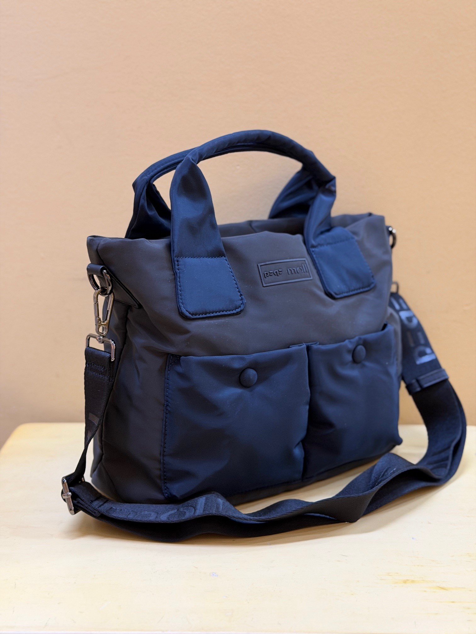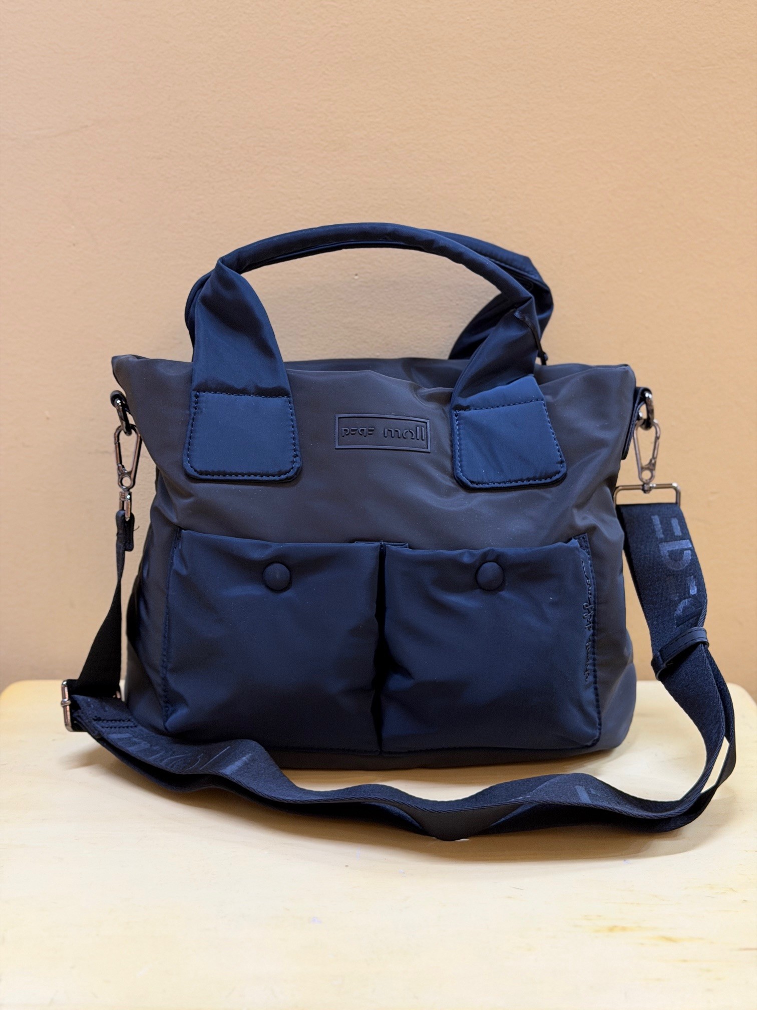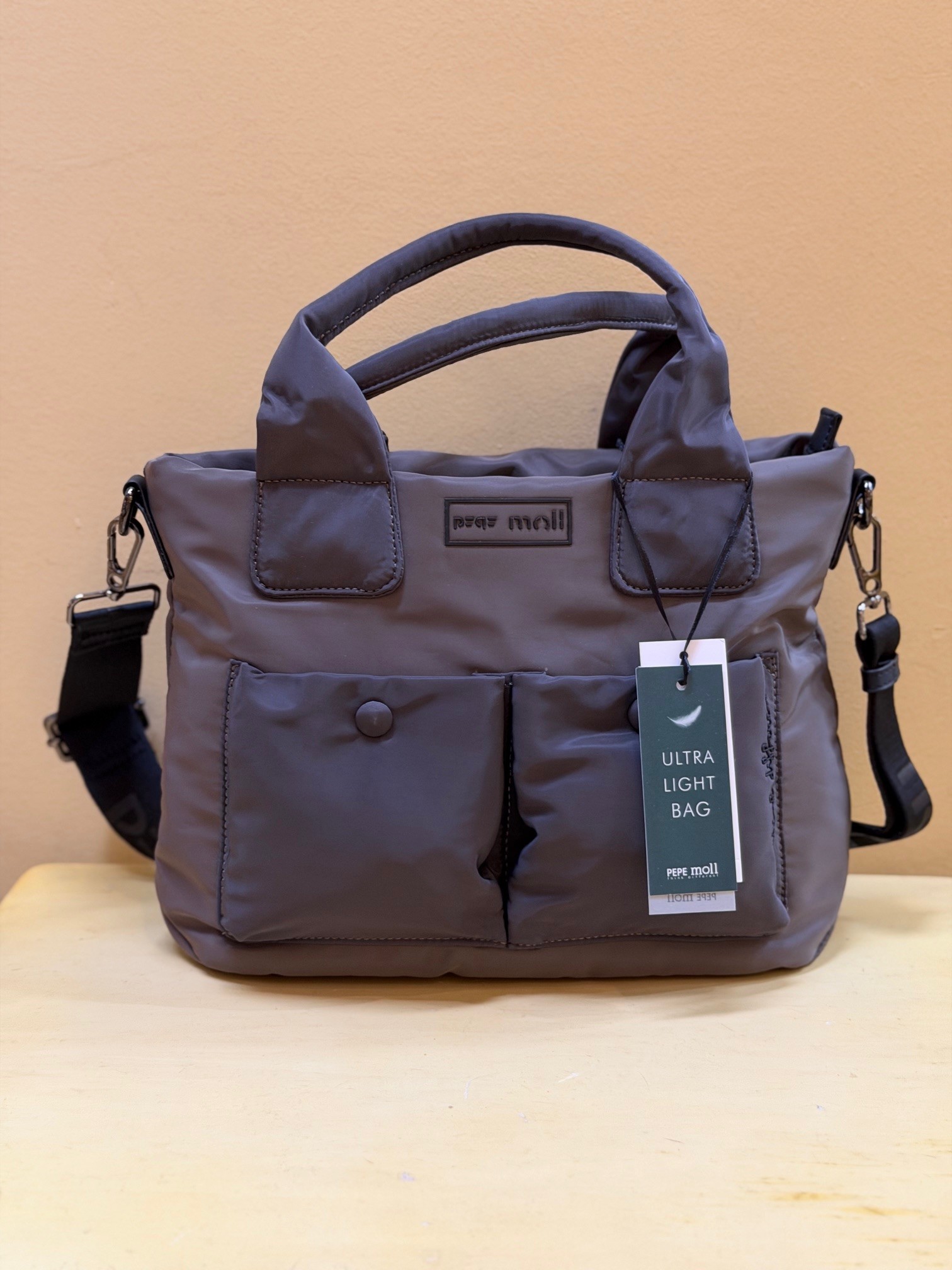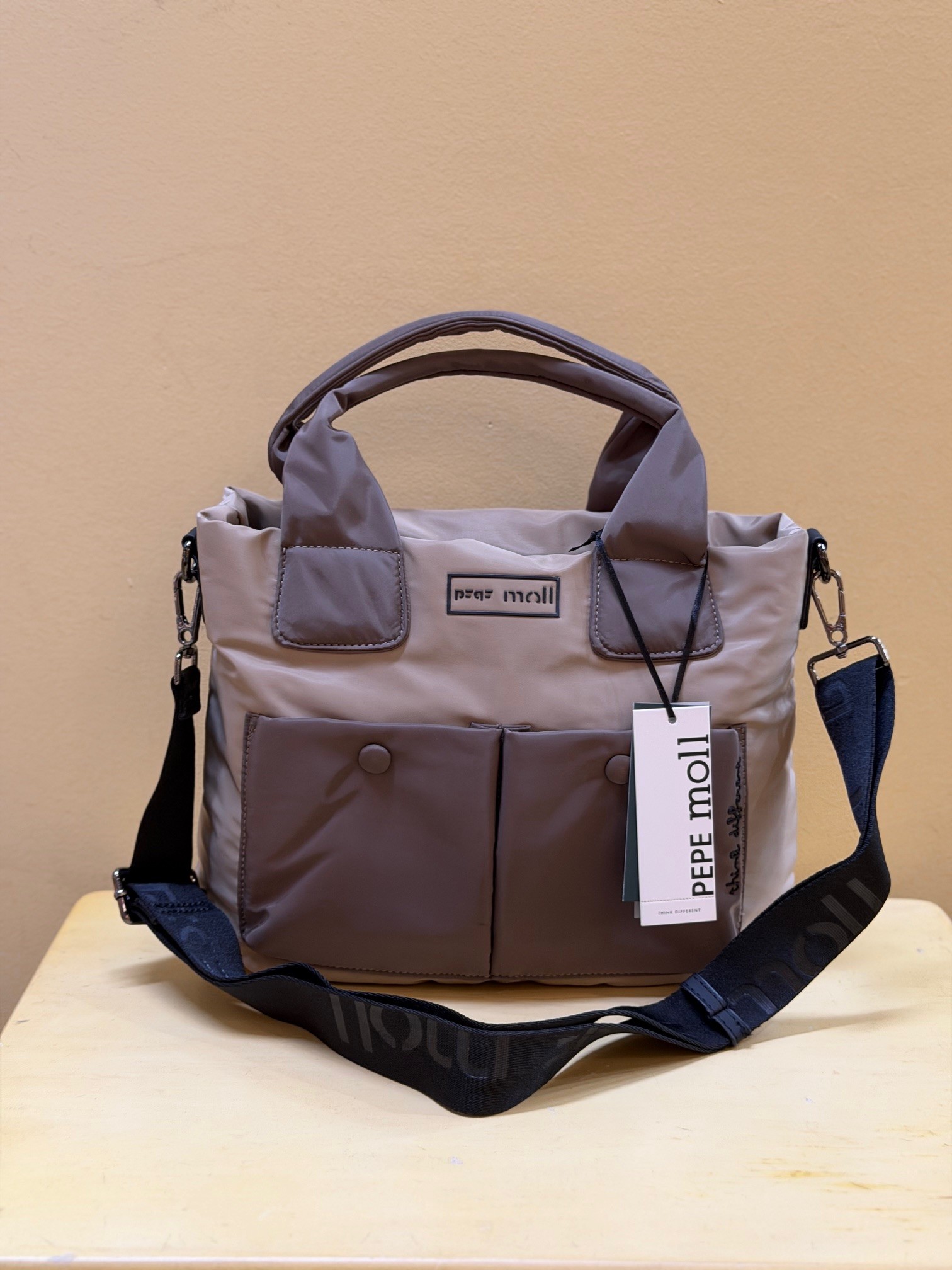 Bolso tipo contenedor con asas de mano y otra para colgar, y bolsillos de parche en el frontal y de cremallera en la parte posterior. además de otros dentro.