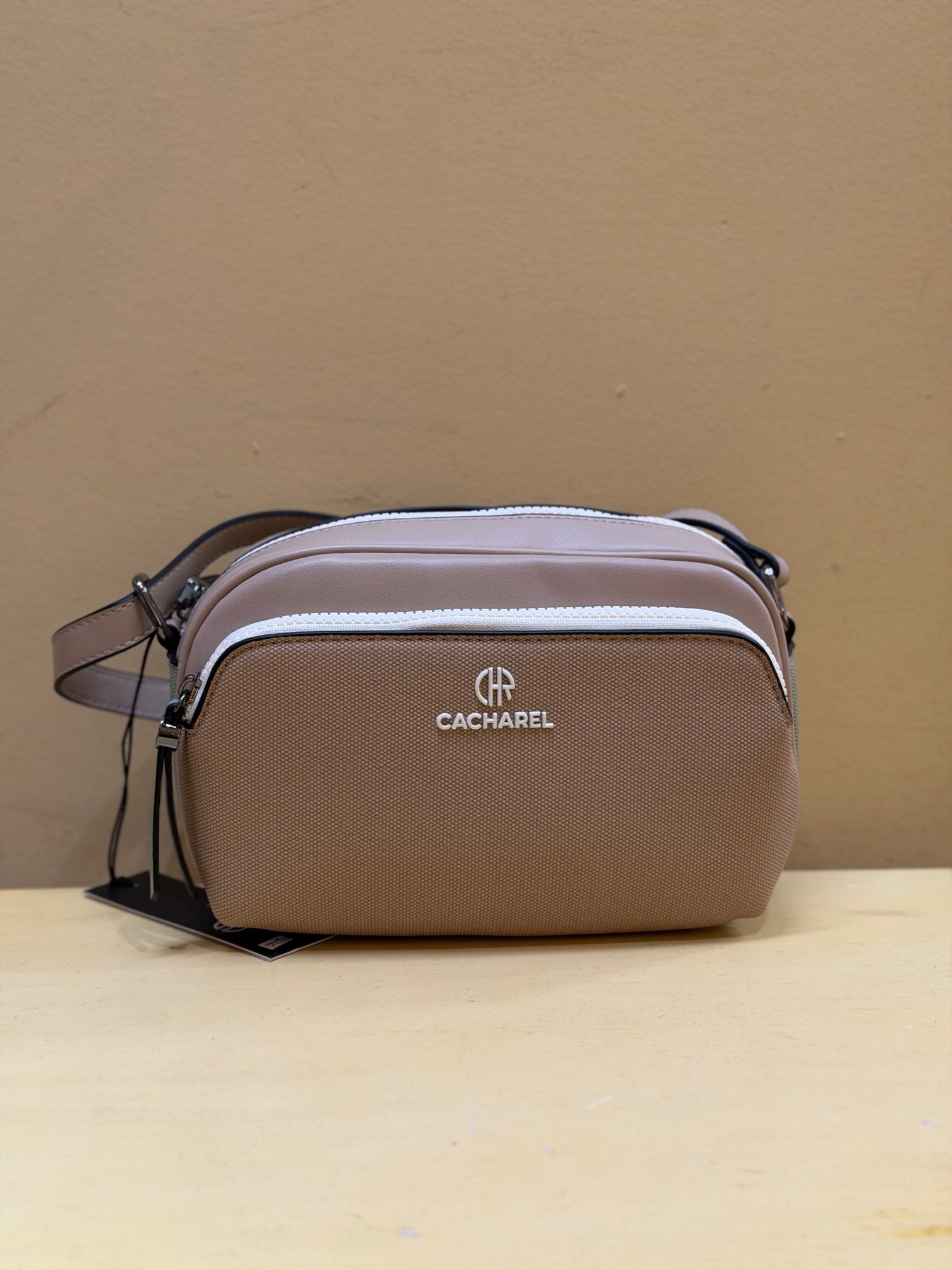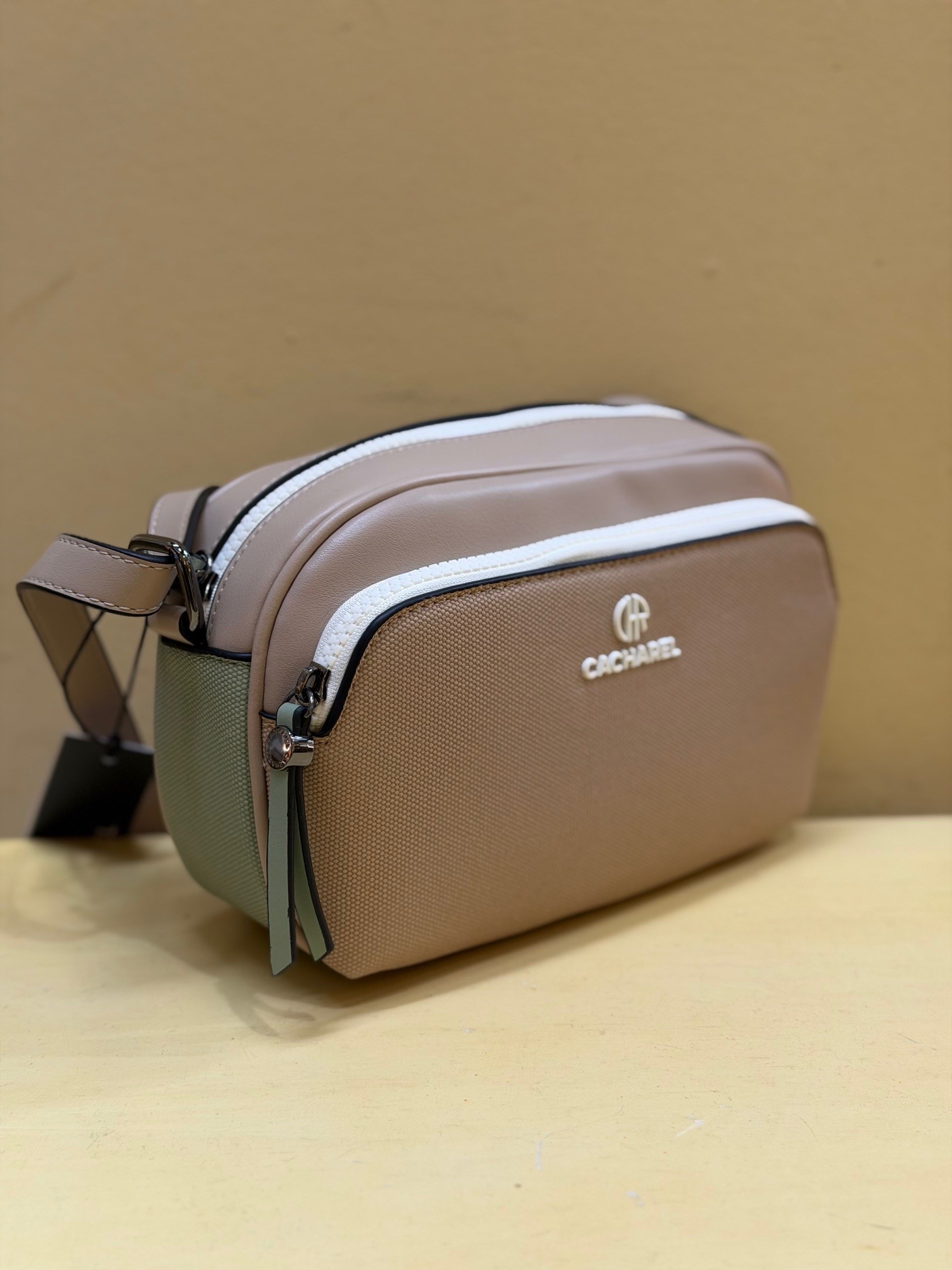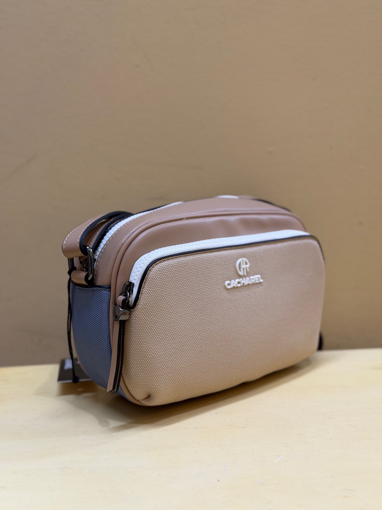 Bolso tipo contenedor de tamaño pequeño y tricolor, de Cacharel. Súper ligero, con asa extensible, dos departamentos exteriores más un bolsillo. Además de otros interiores.