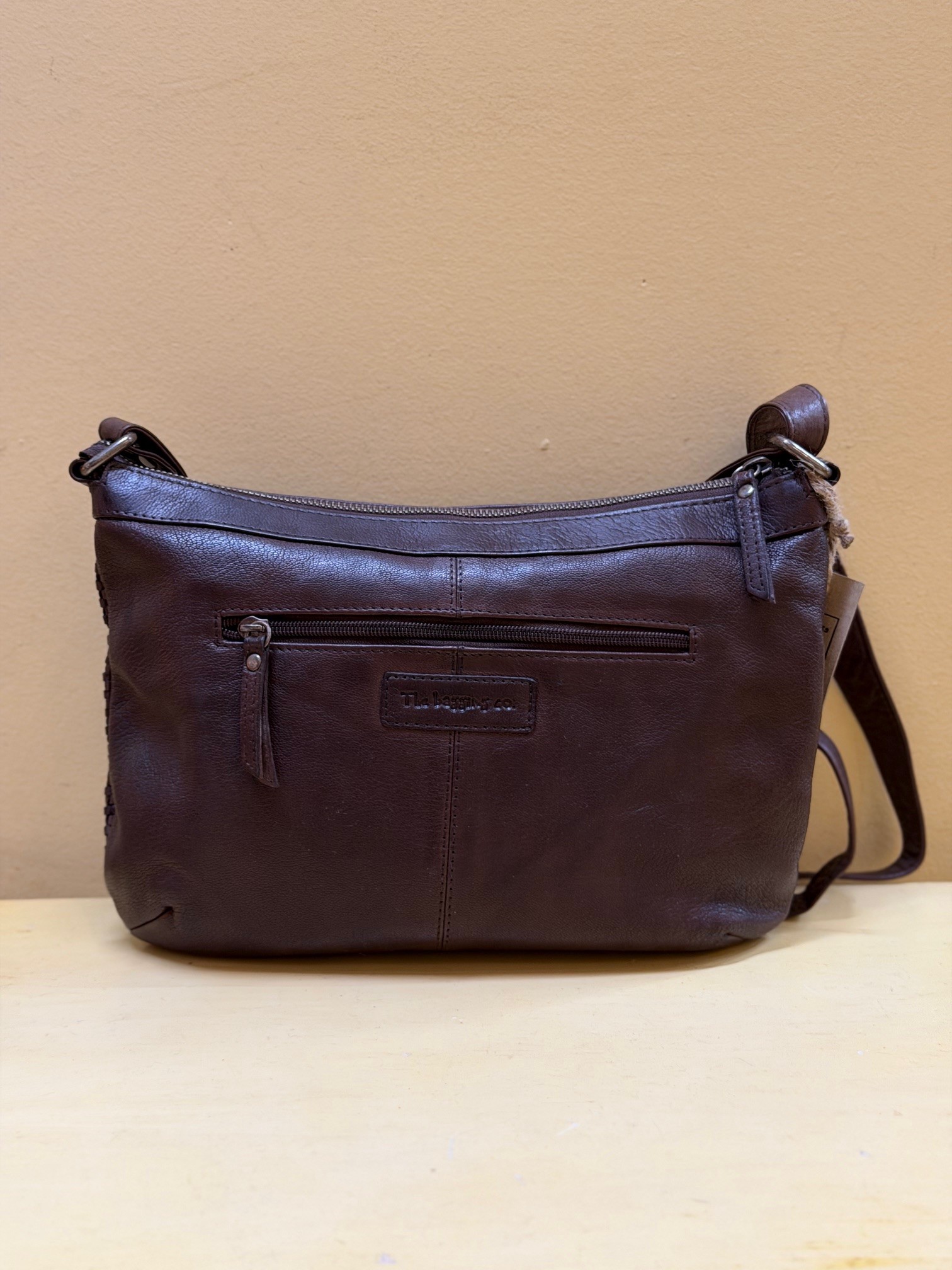 Bolso ideal para cruzar, realizado en piel y con el frontal trenzado a mano. Ligero, con asa regulable y bolsillo exterior, además de otros en el interior.