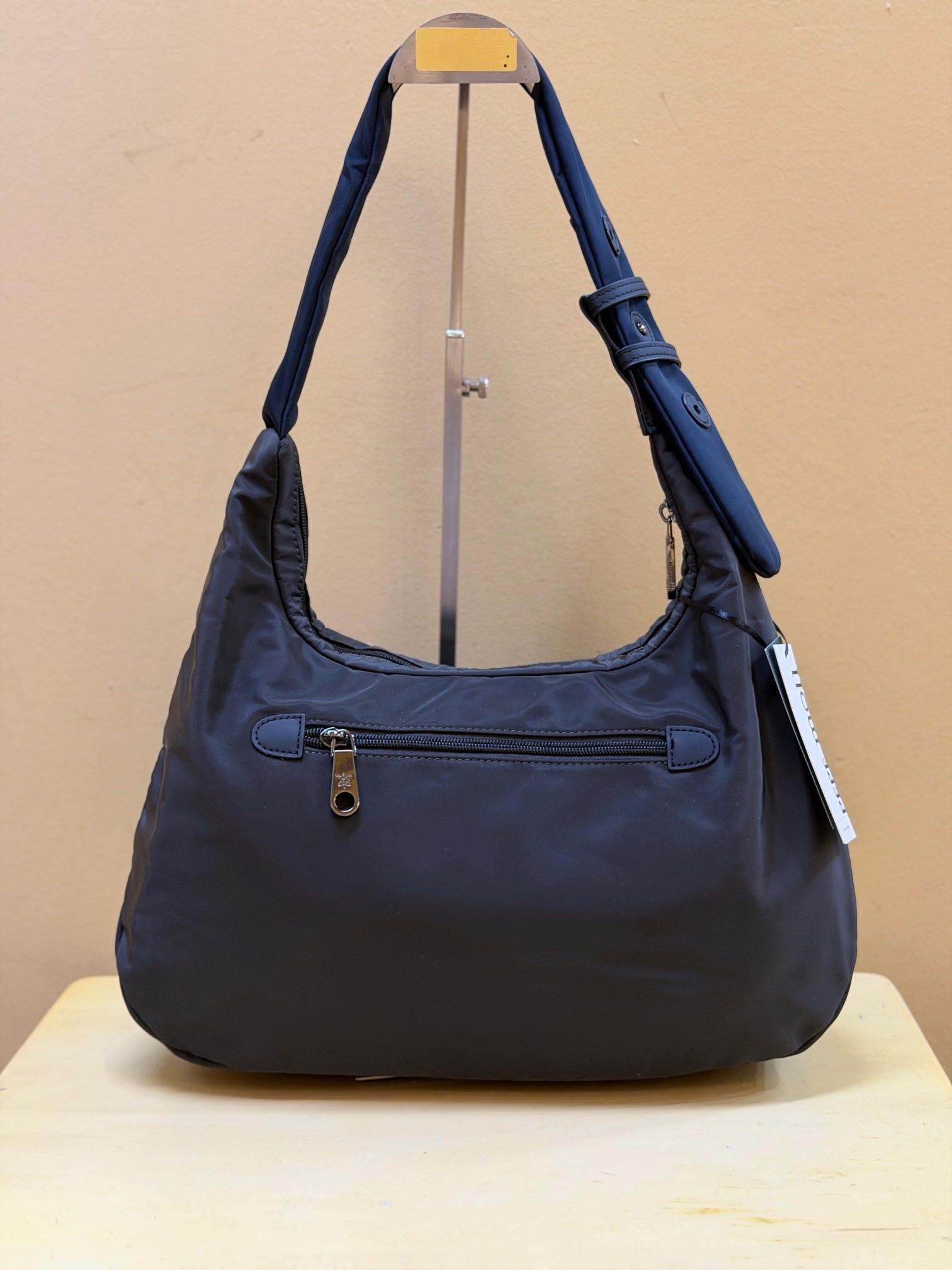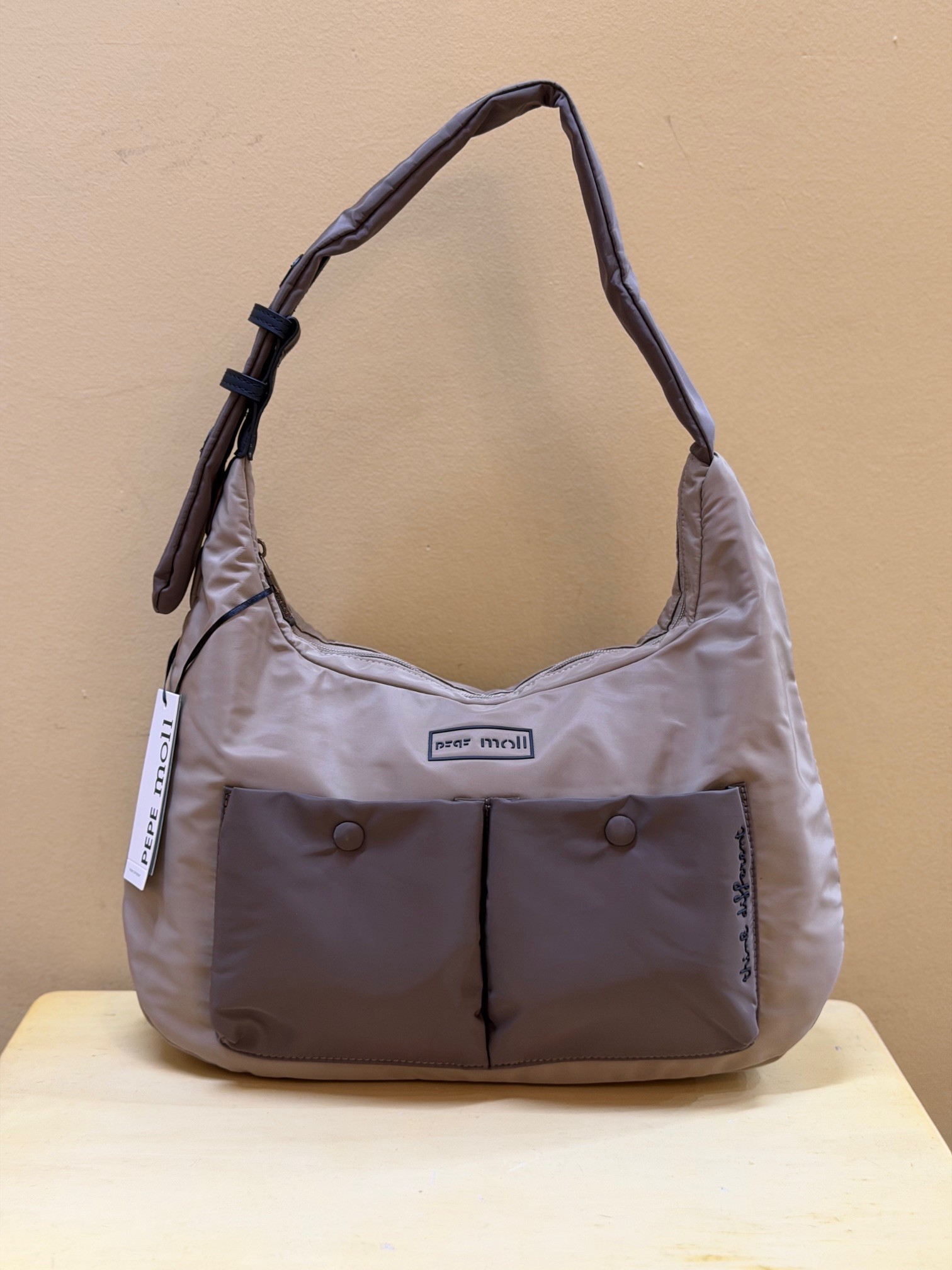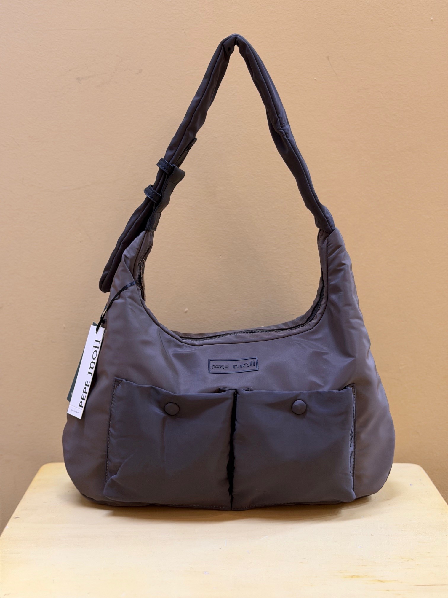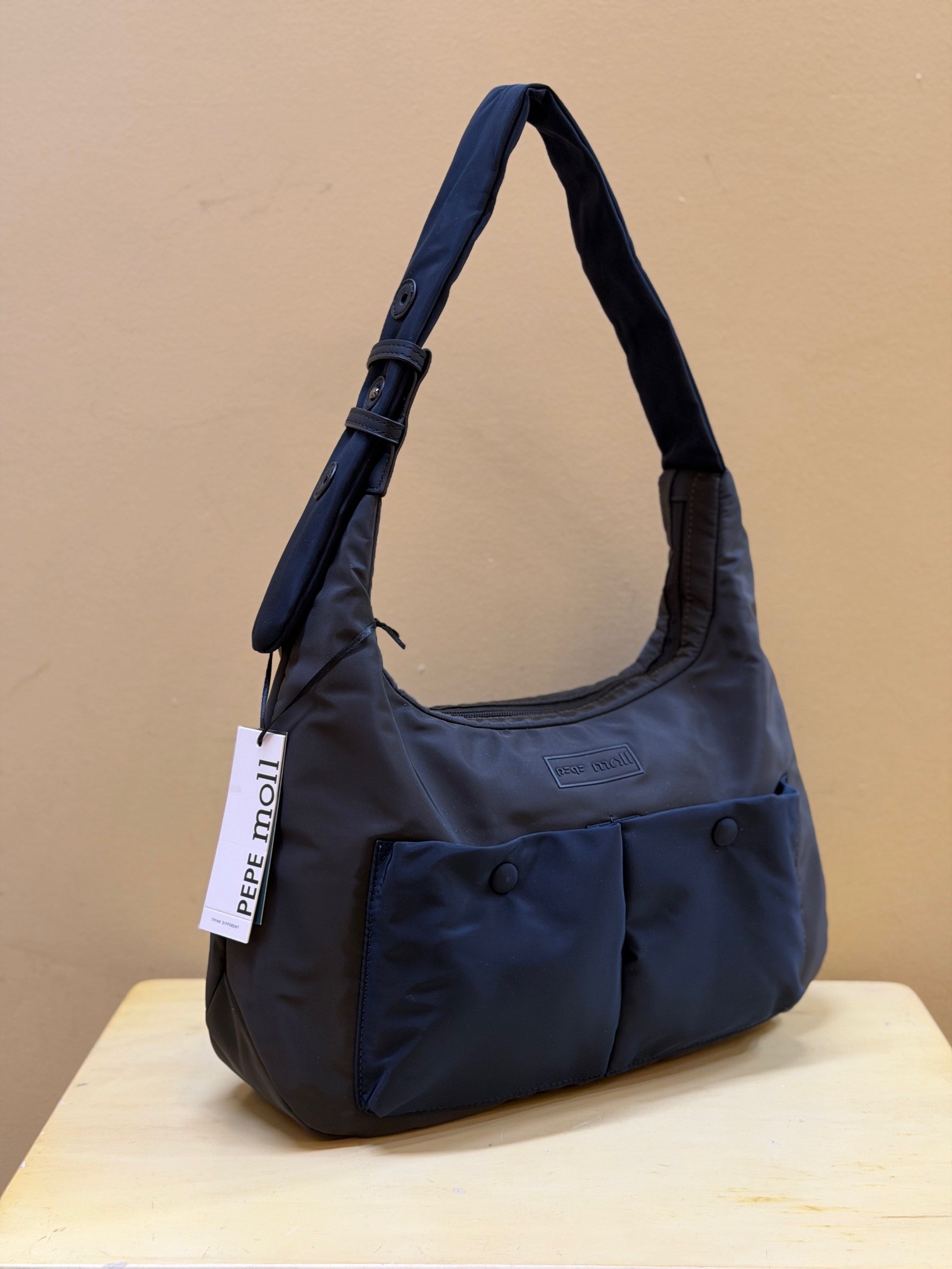 Bolso hobo realizado en nylon fuerte, suave y súper ligero, con bolsillos de parche en el frontal. además tiene otro exterior con cremallera y otros en el interior.