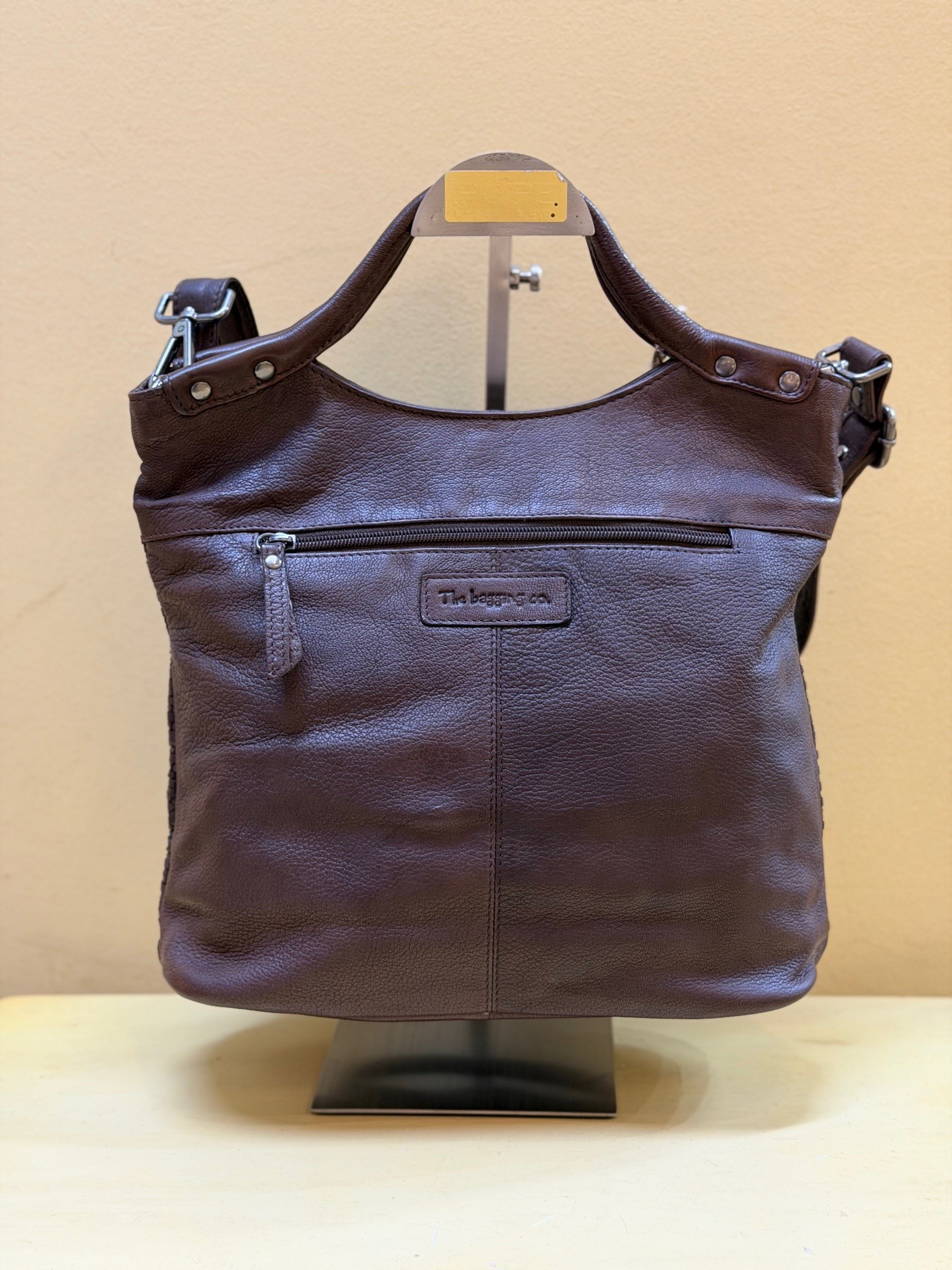Bolso de mano, cruzar o colgar y realizado en piel con el frontal trenzado a mano.