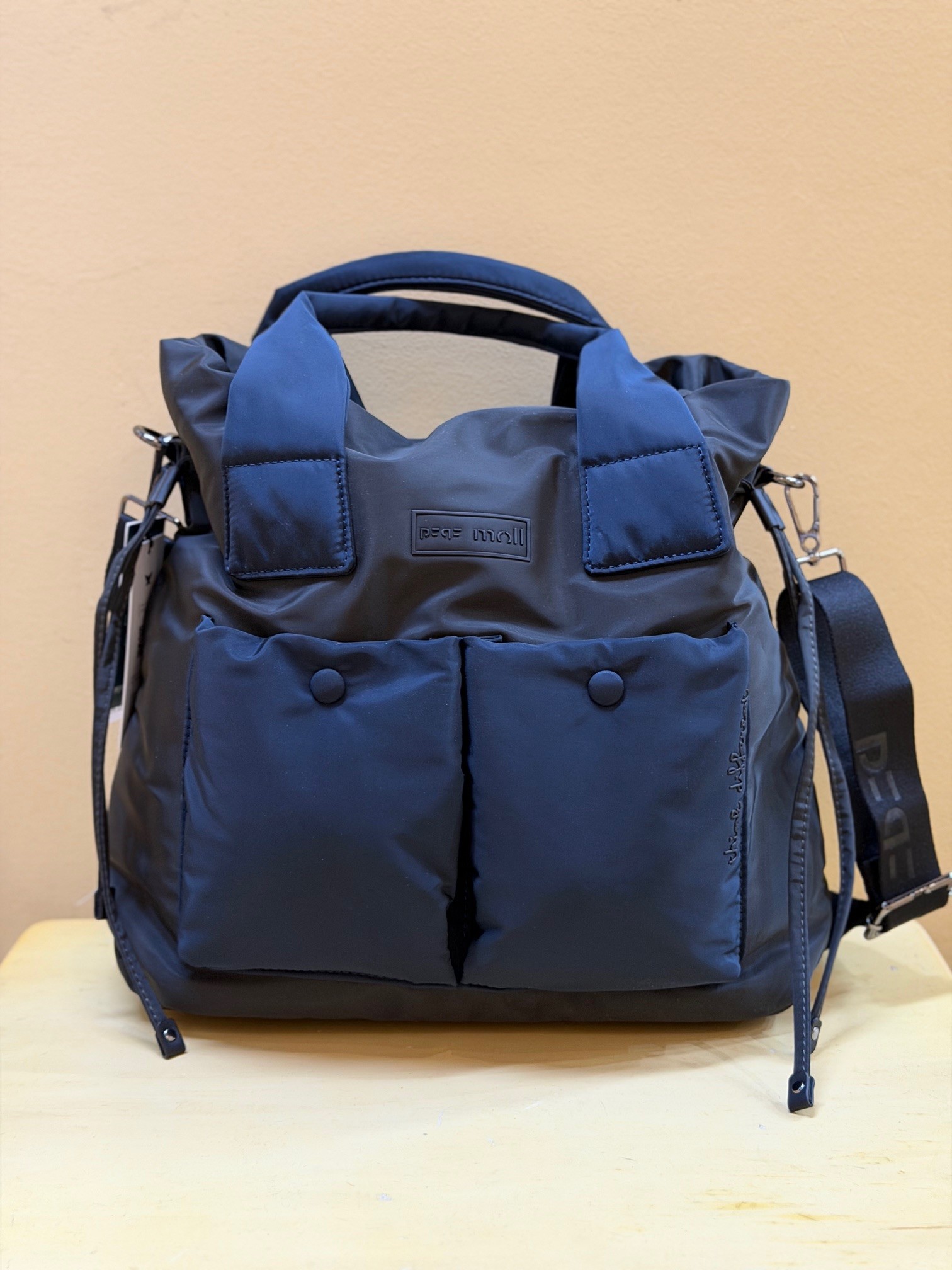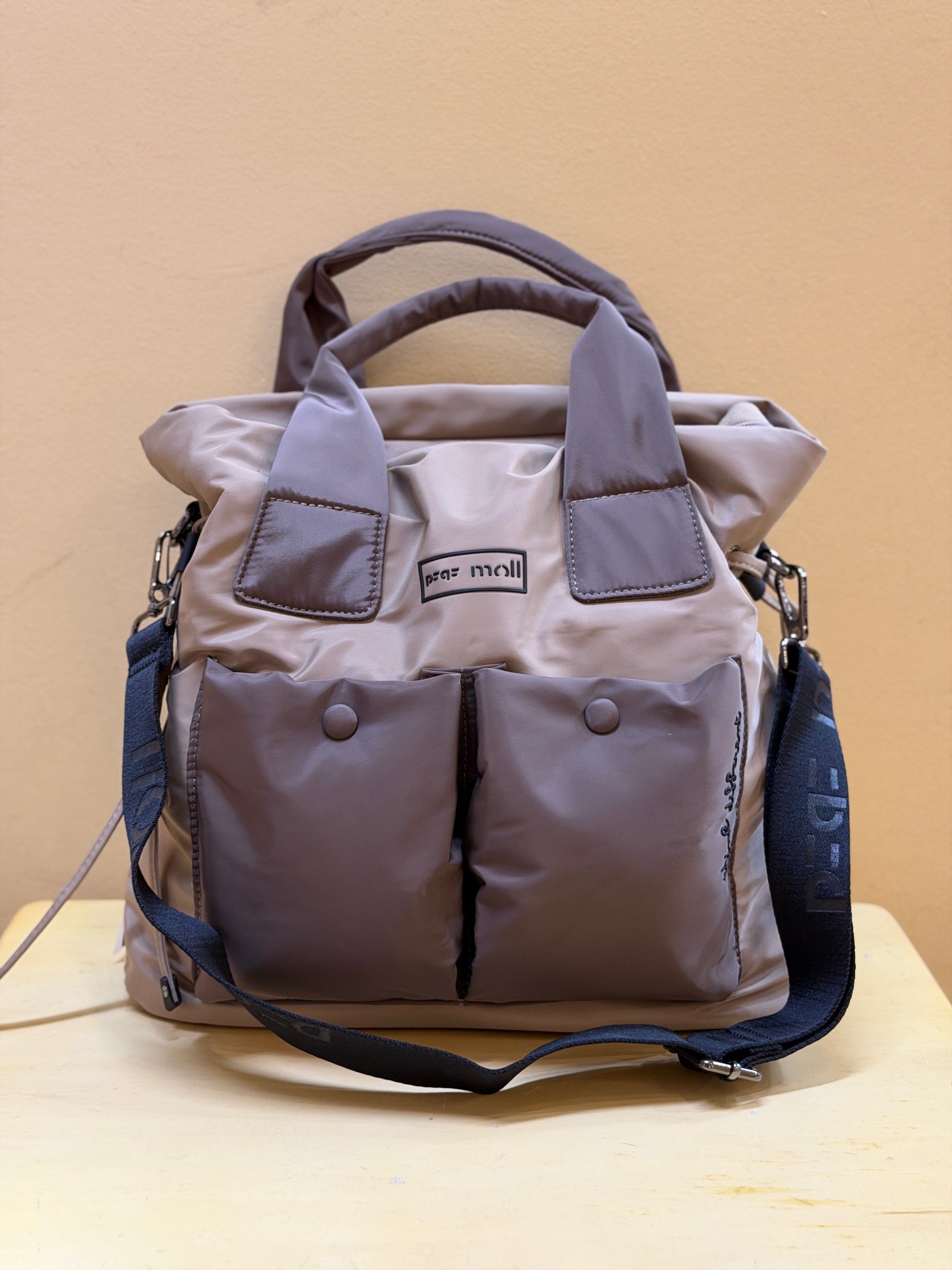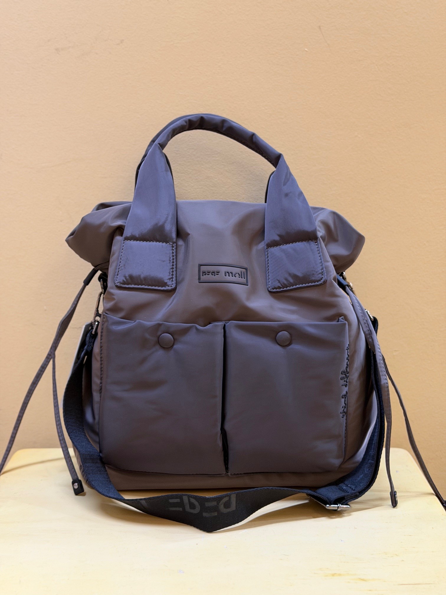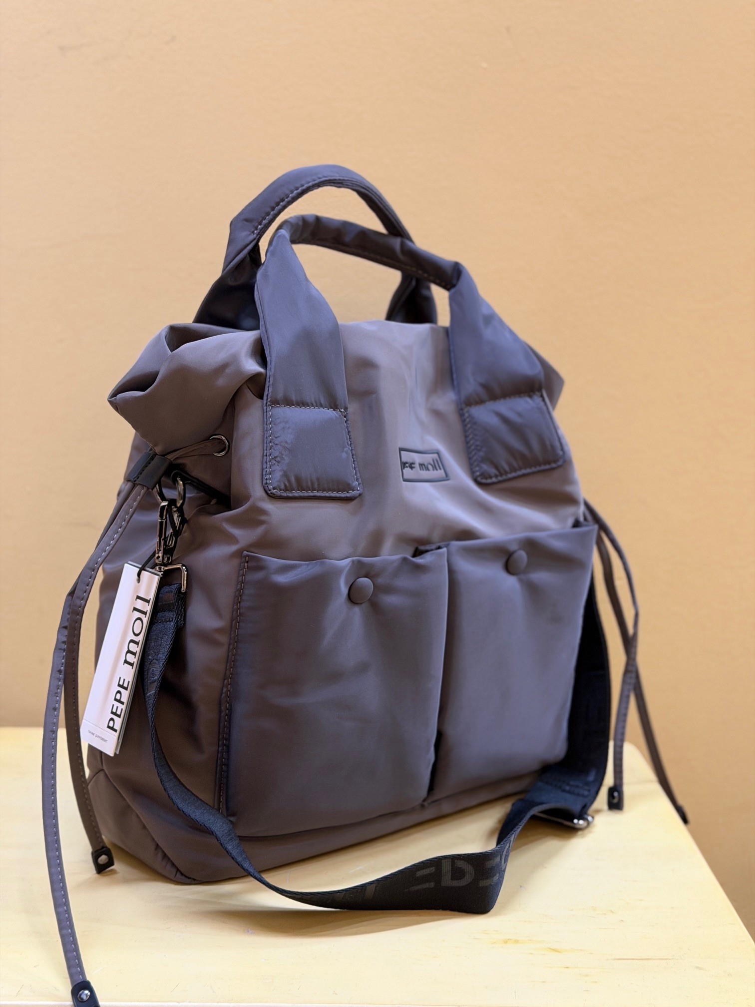 Bolso y mochila realizado en nylon suave, fuerte y súper ligero, con tres bolsillos exteriores. Dos de parche y uno posterior con cremallera, además de otros en el interior.