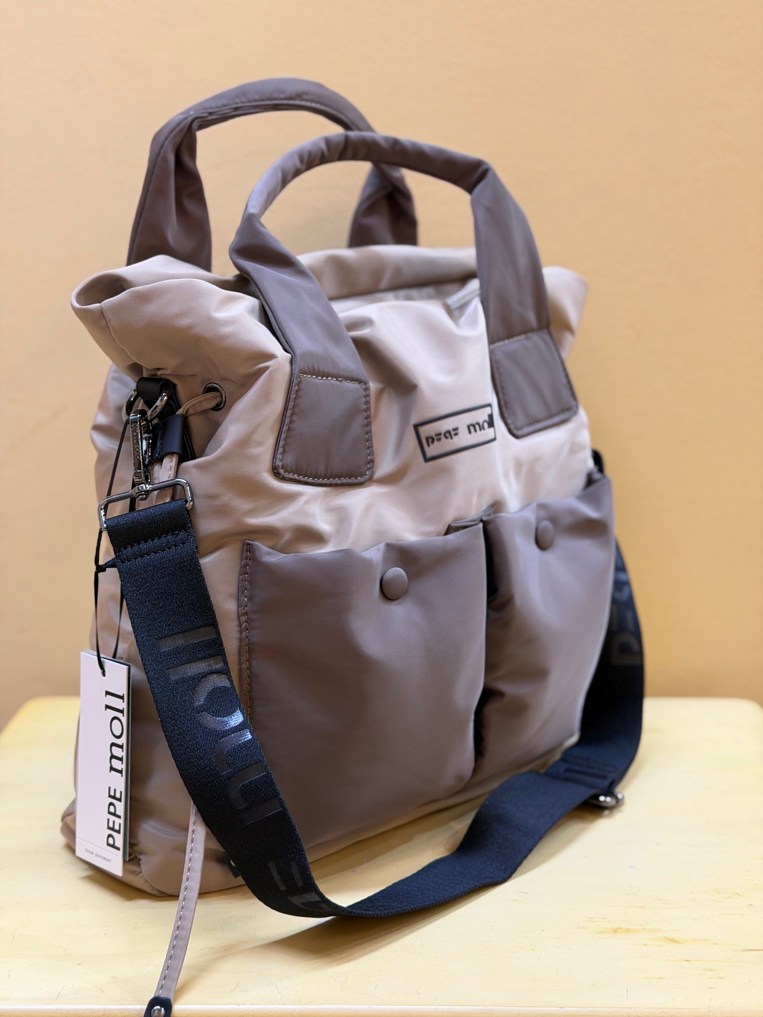 Se puede llevar con asas de mano, con otra para colgar o cruzar, o con dos detrás para llevar como mochila.