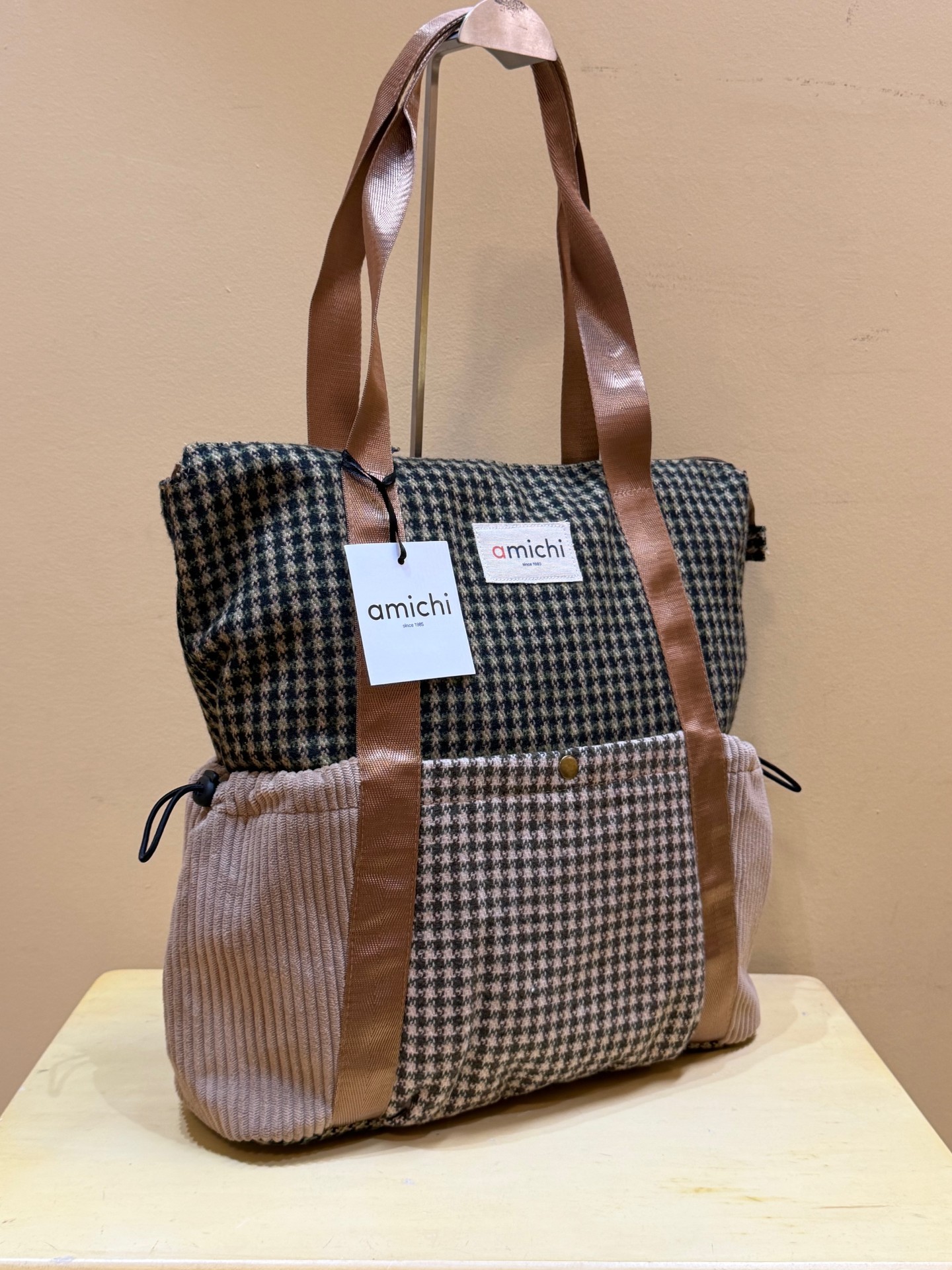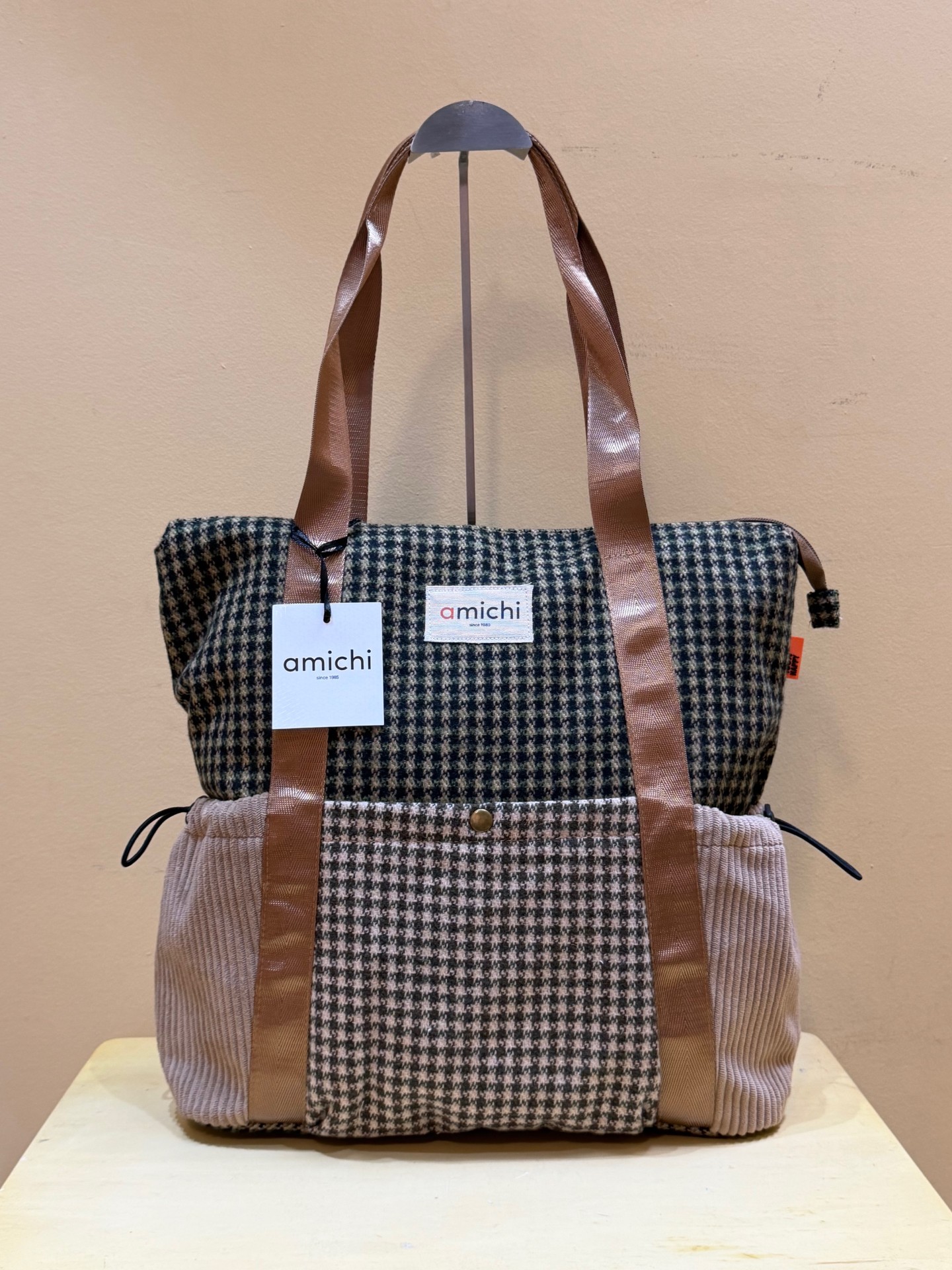 Bolso tipo shopping realizado con varios tejidos de cuadros y pana, de Amichi.