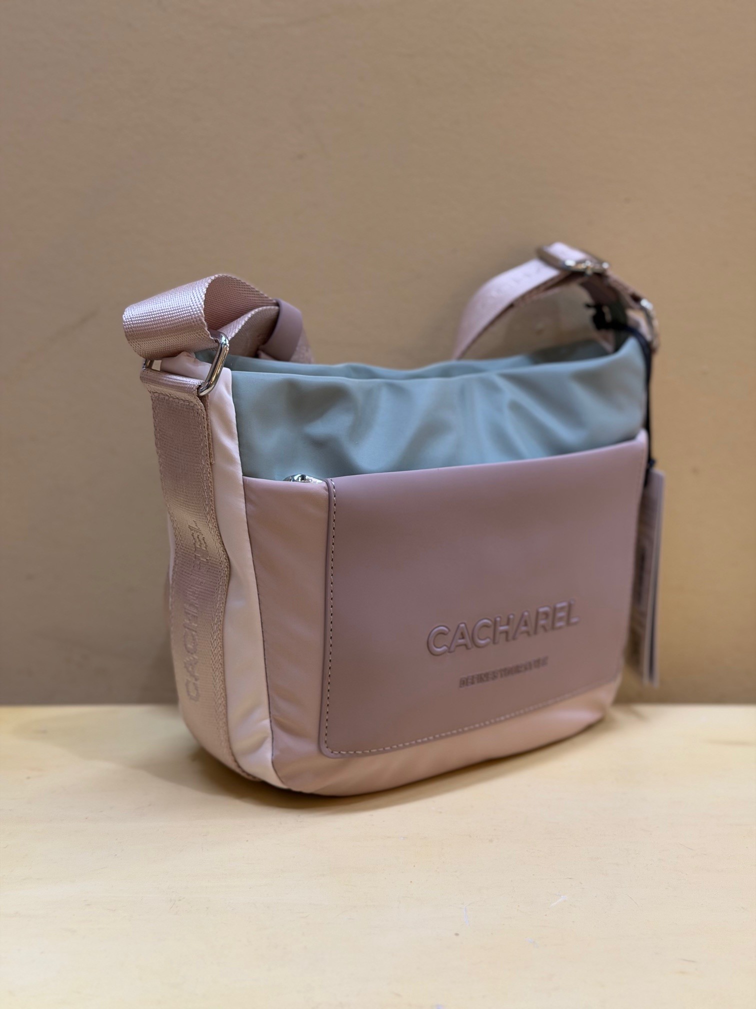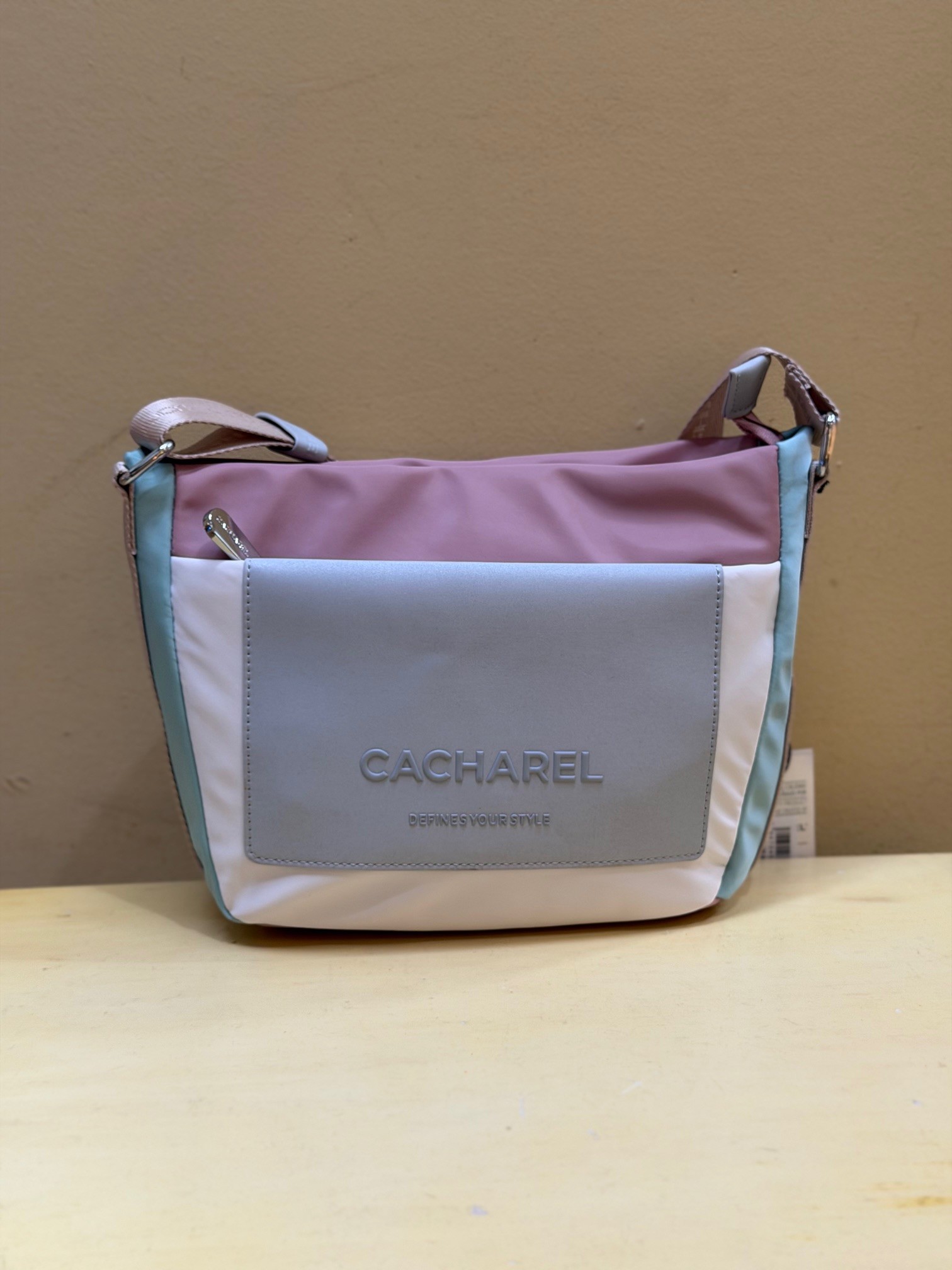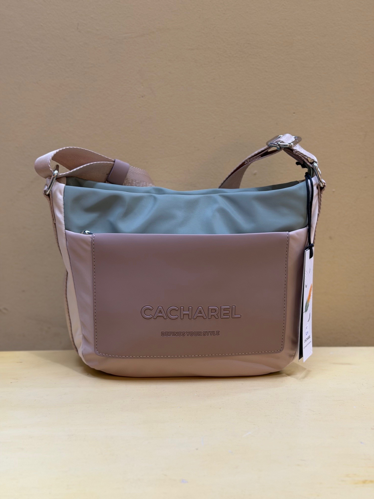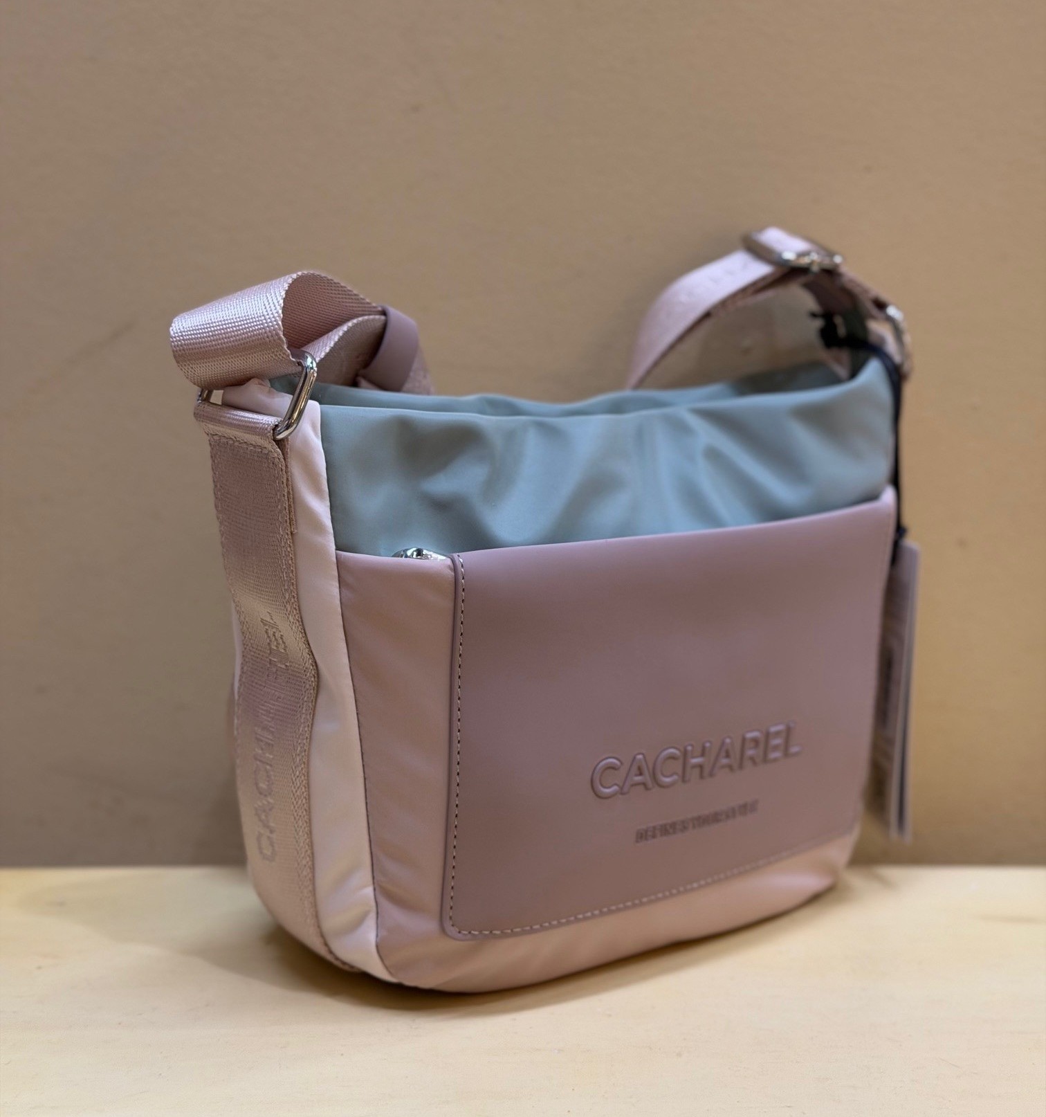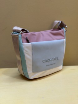 Bolso tricolor realizado en nylon, de Cacharel. Súper ligero, con dos bolsillos exteriores y otros en interior. Lleva asa ancha y extensible para más comodidad.