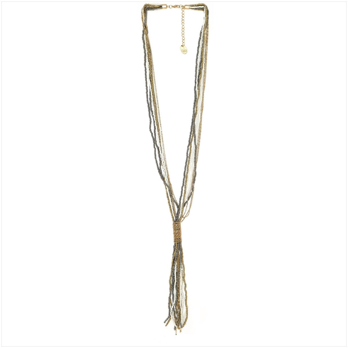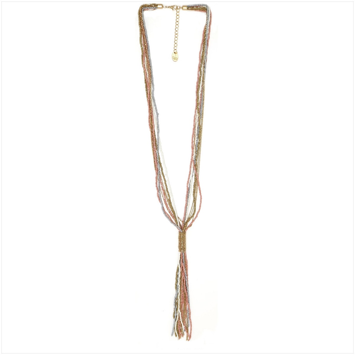 Mide 80 centímetros de largo, más 19 cm de fleco y 10 cm de cadena para ajustar a la medida adecuada