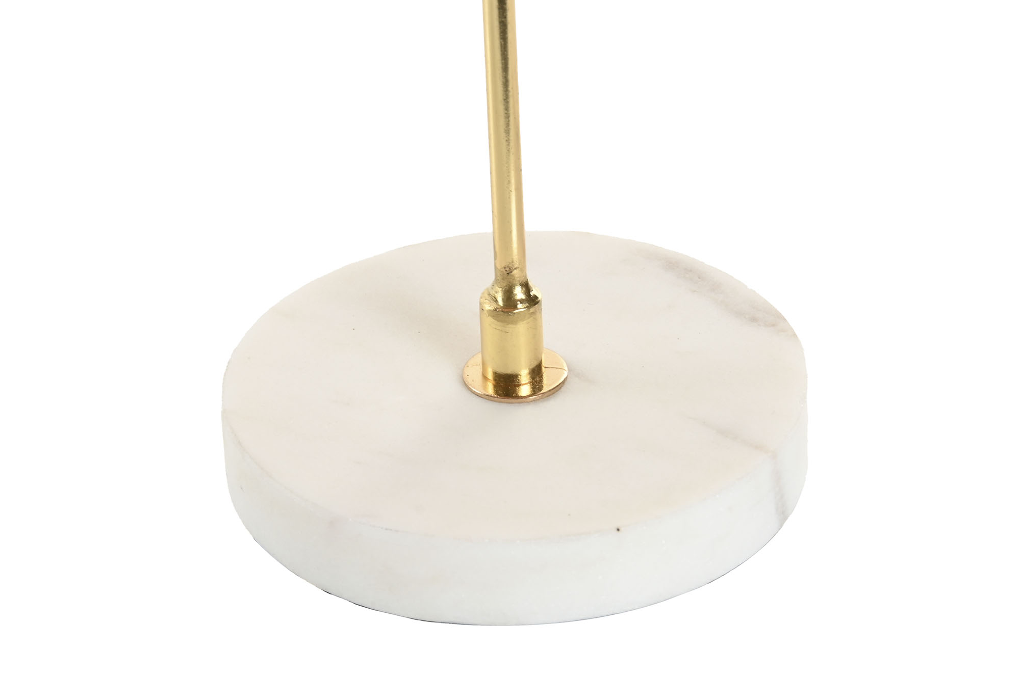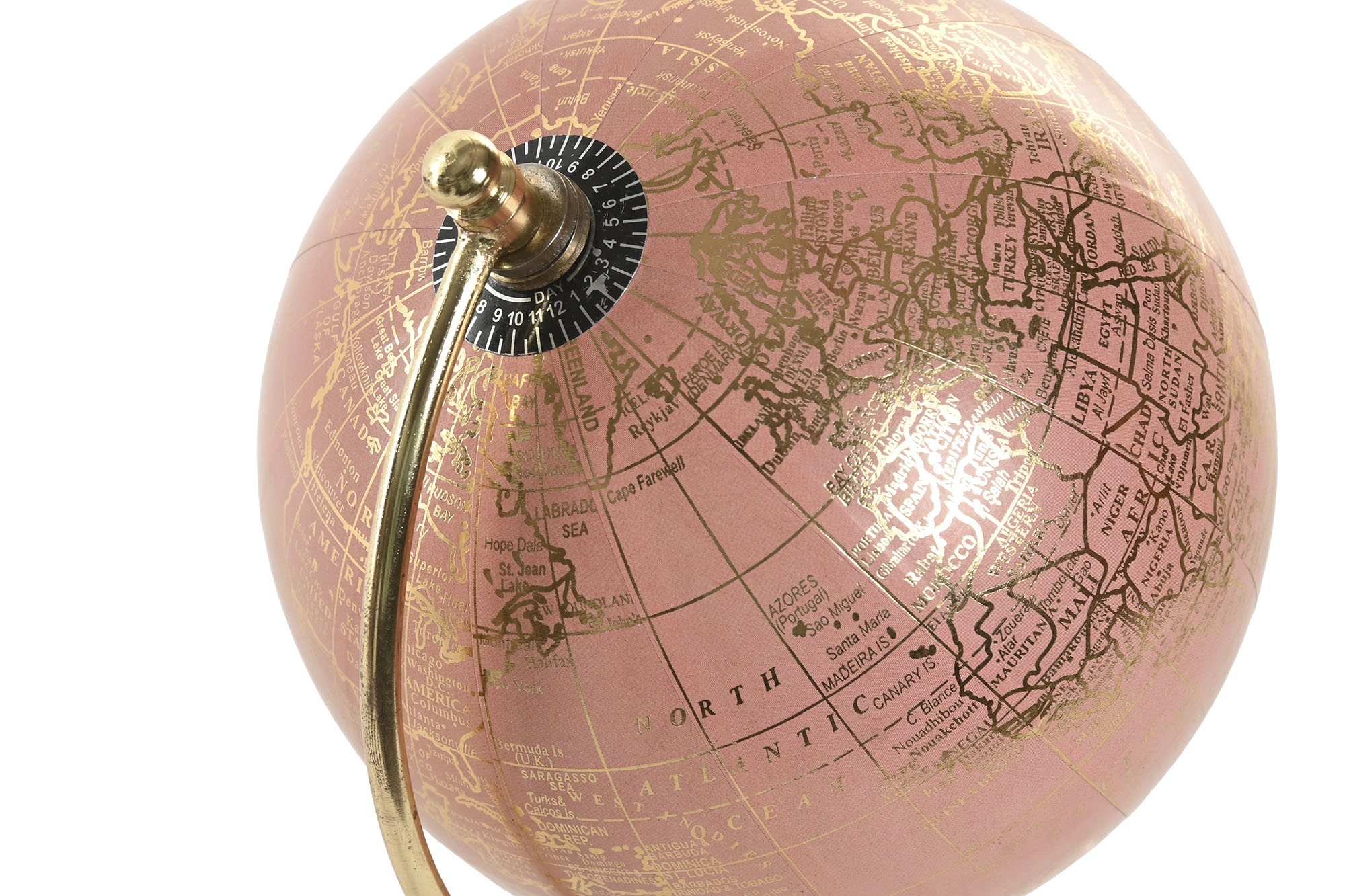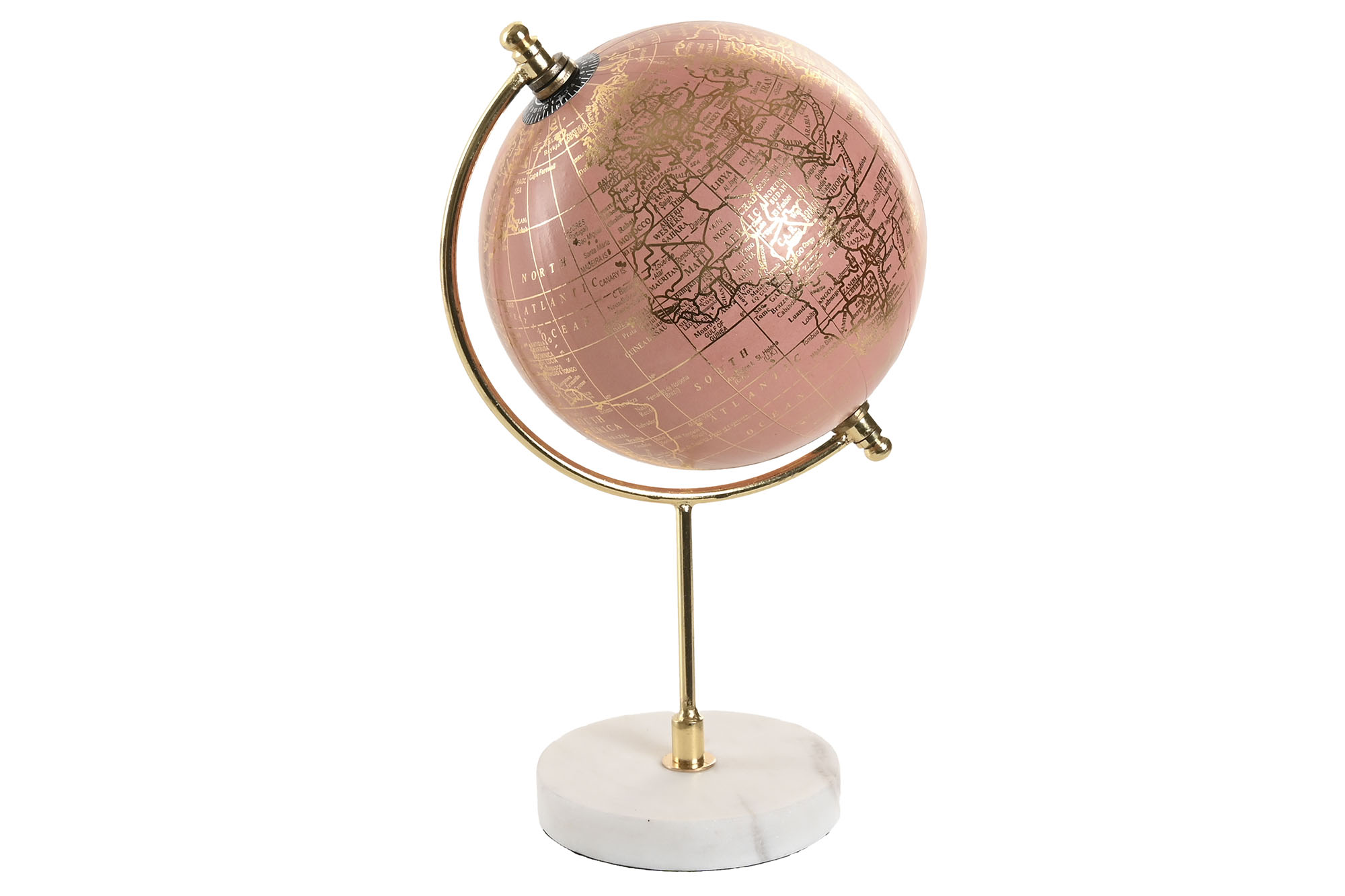 Globo terráqueo de color rosa con acabados en dorado mate y base de mármol.