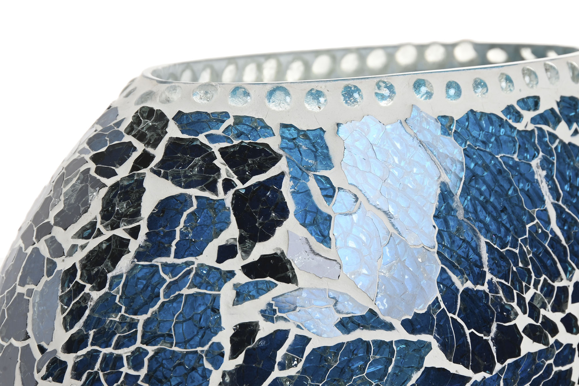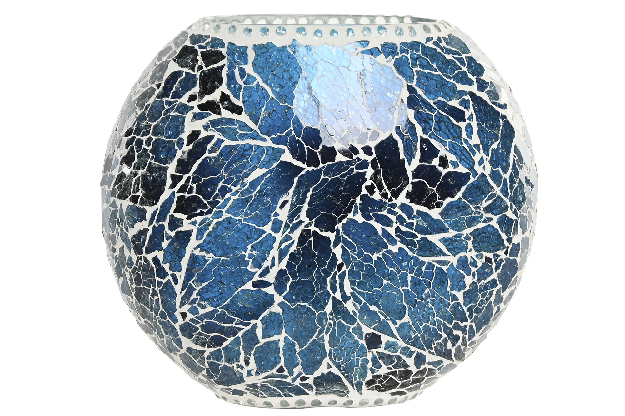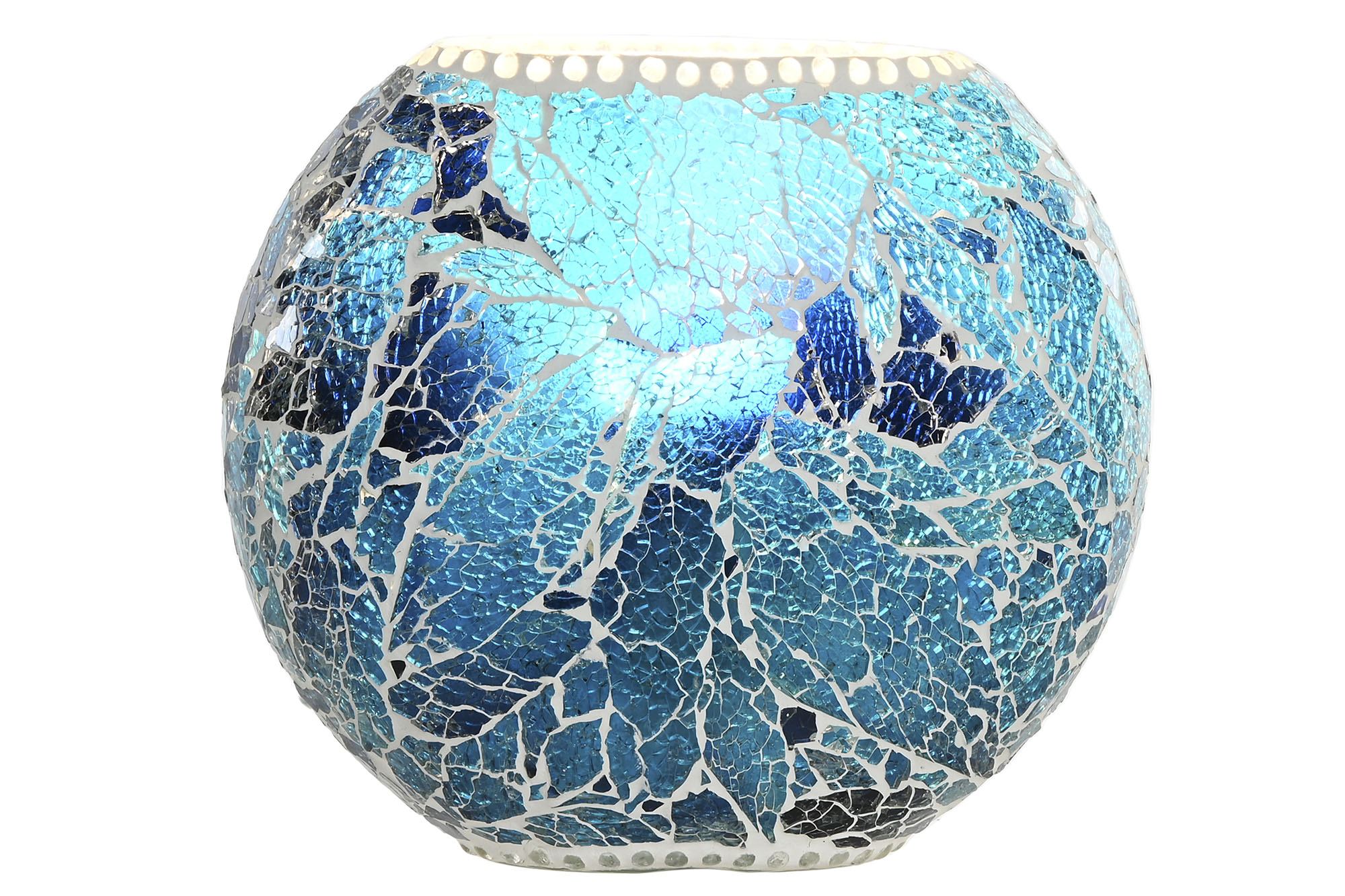 Lámpara con forma casi circular, de cristal craquelado en color azul sobre base de vidrio.
