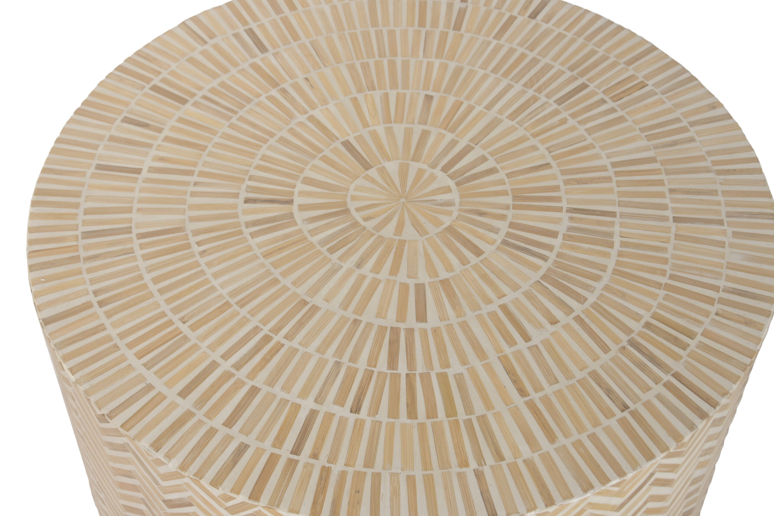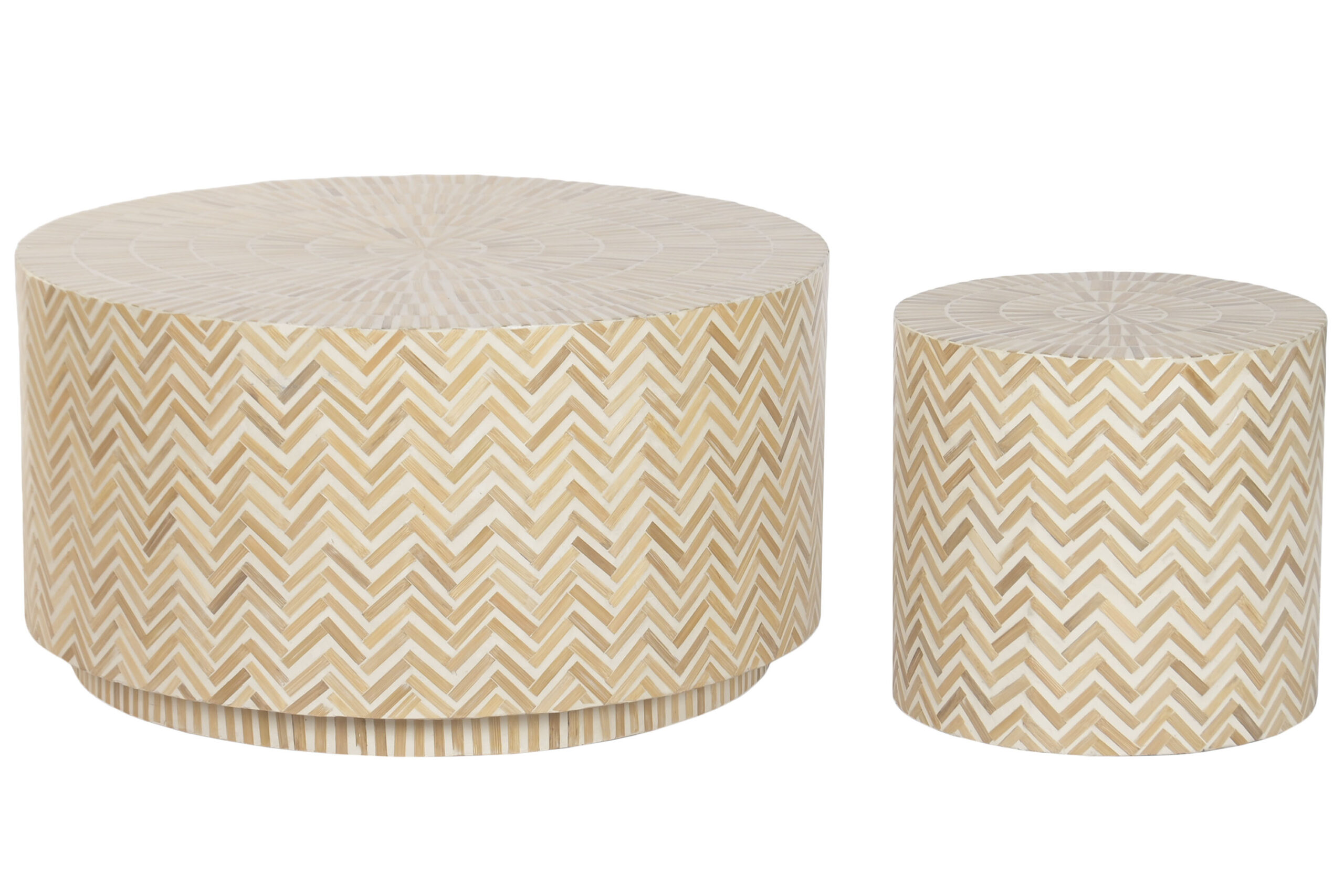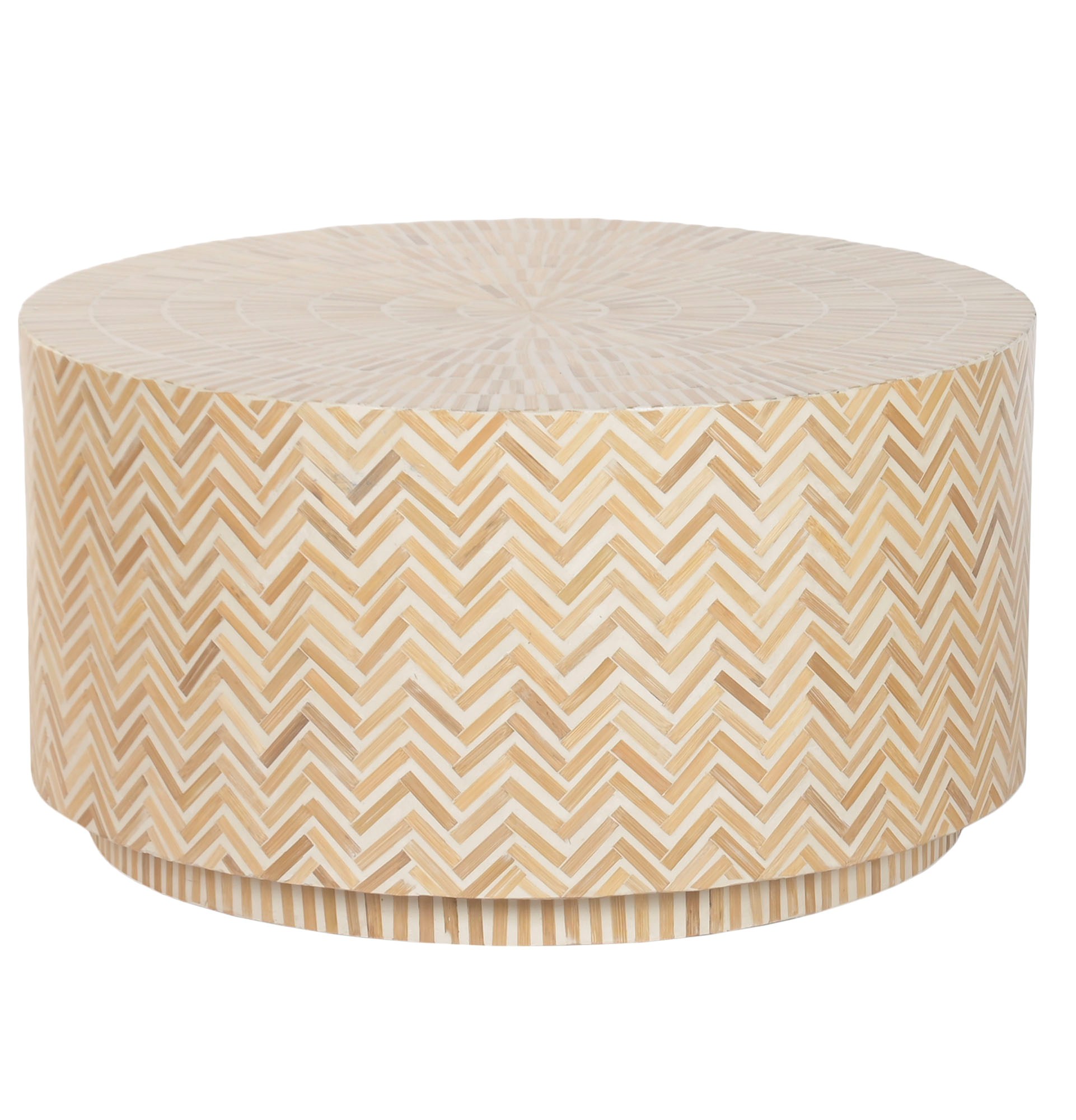Mesa de centro realizada en bambú natural haciendo zigzag alrededor, y resina en color marfil.