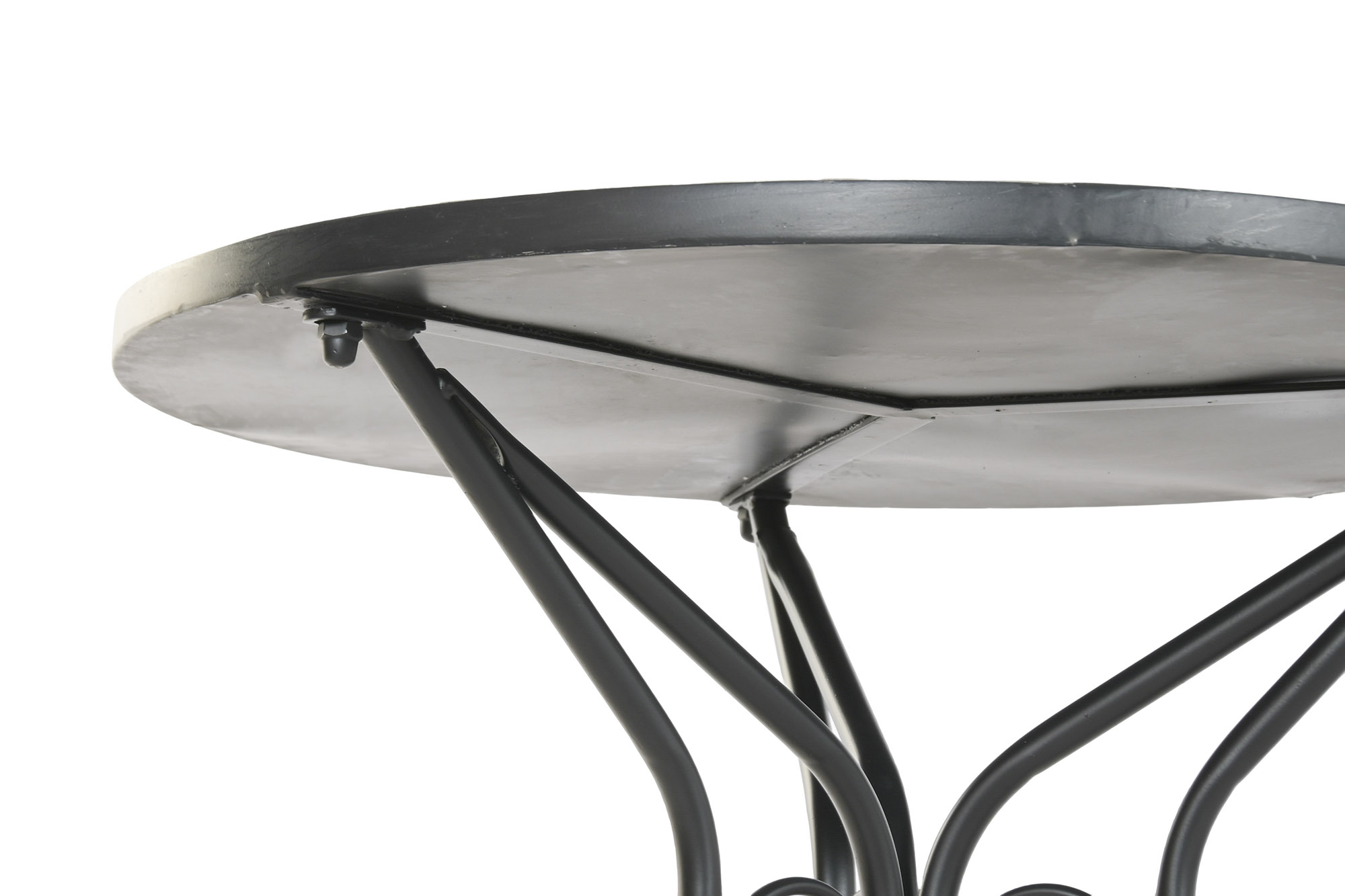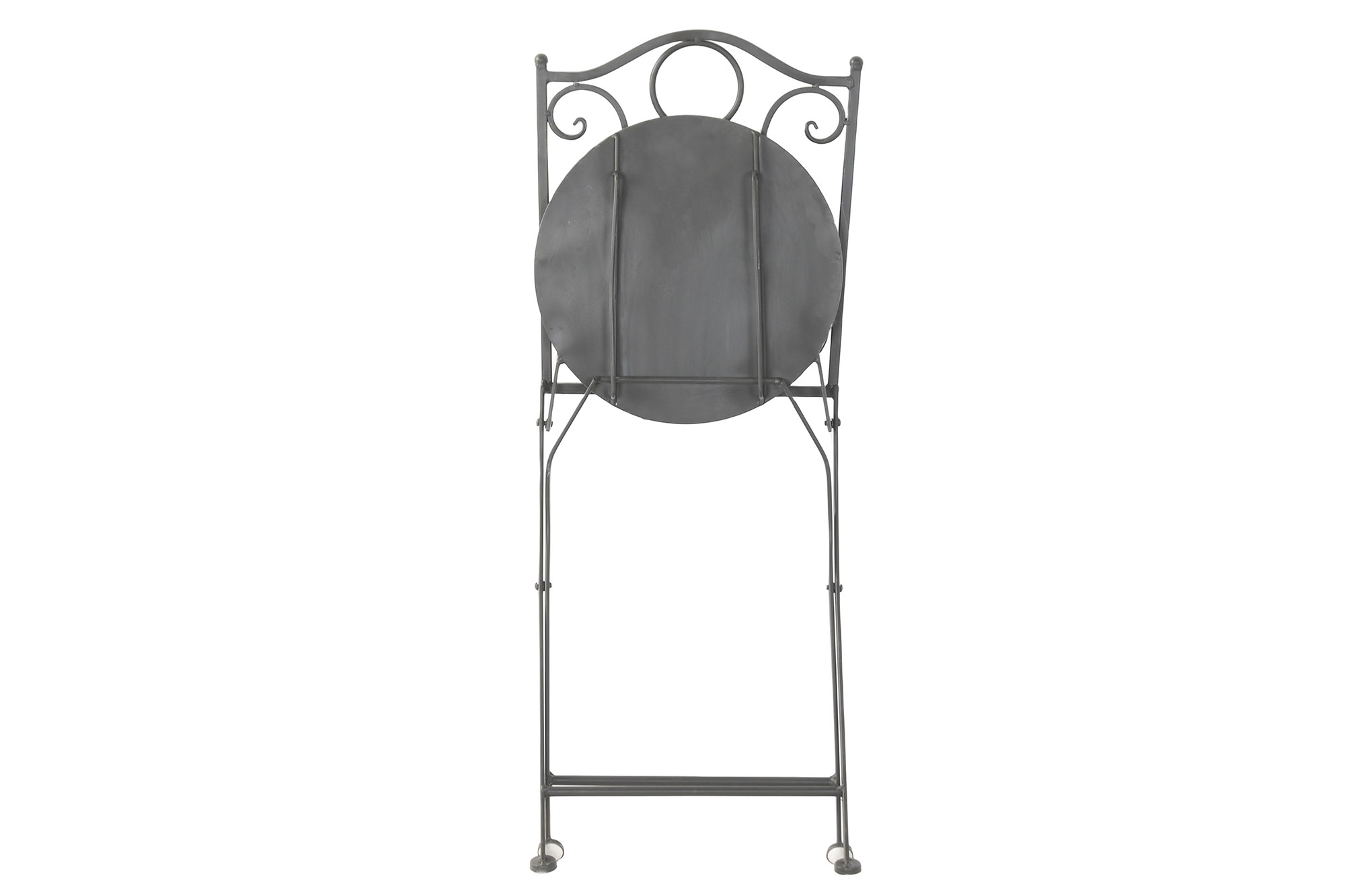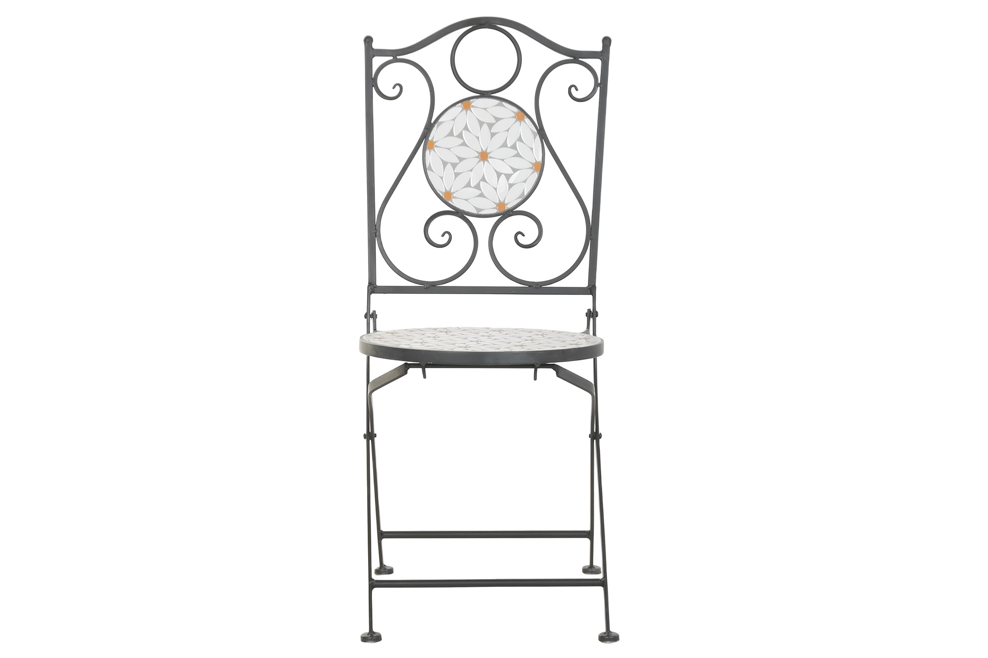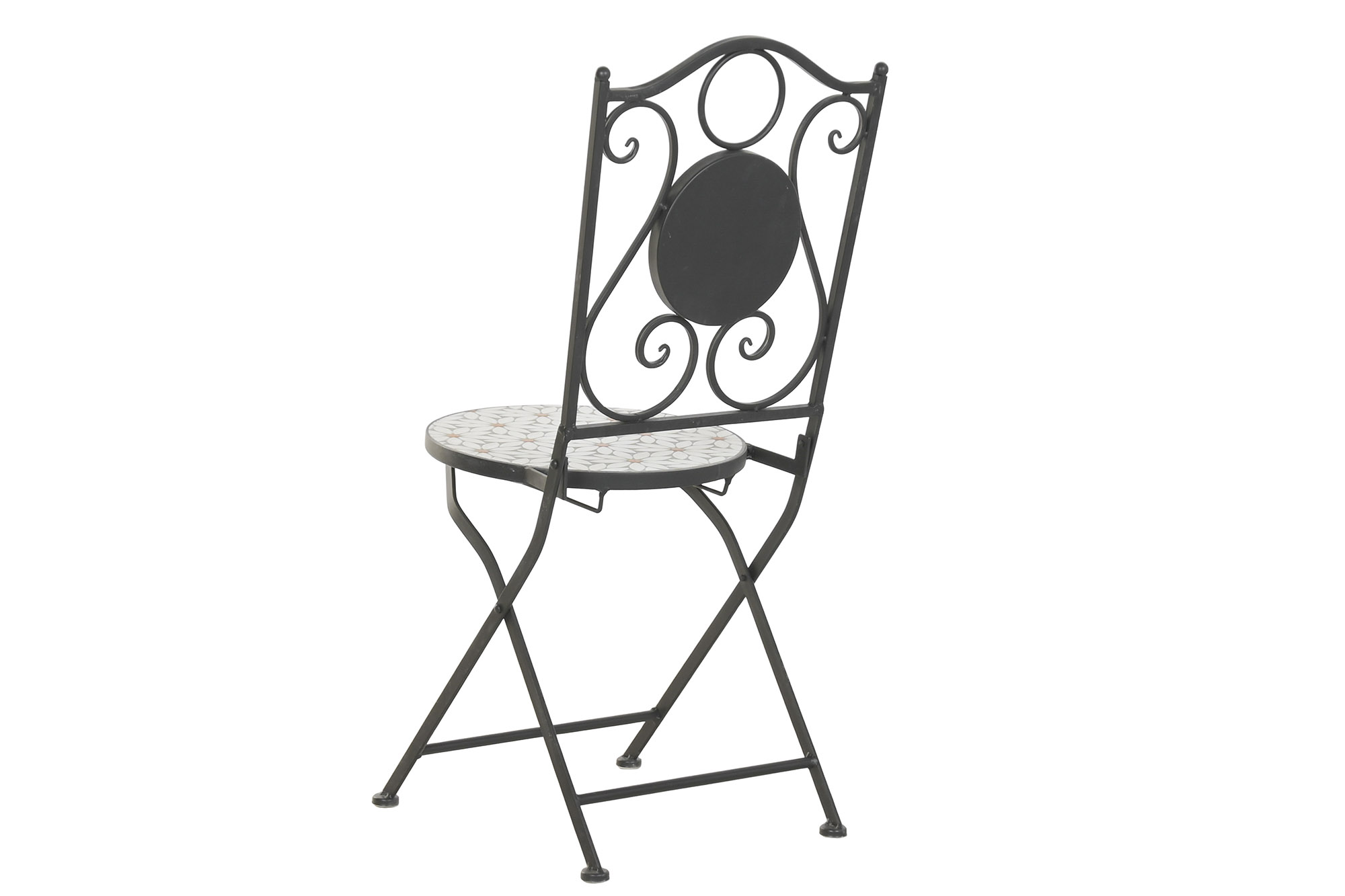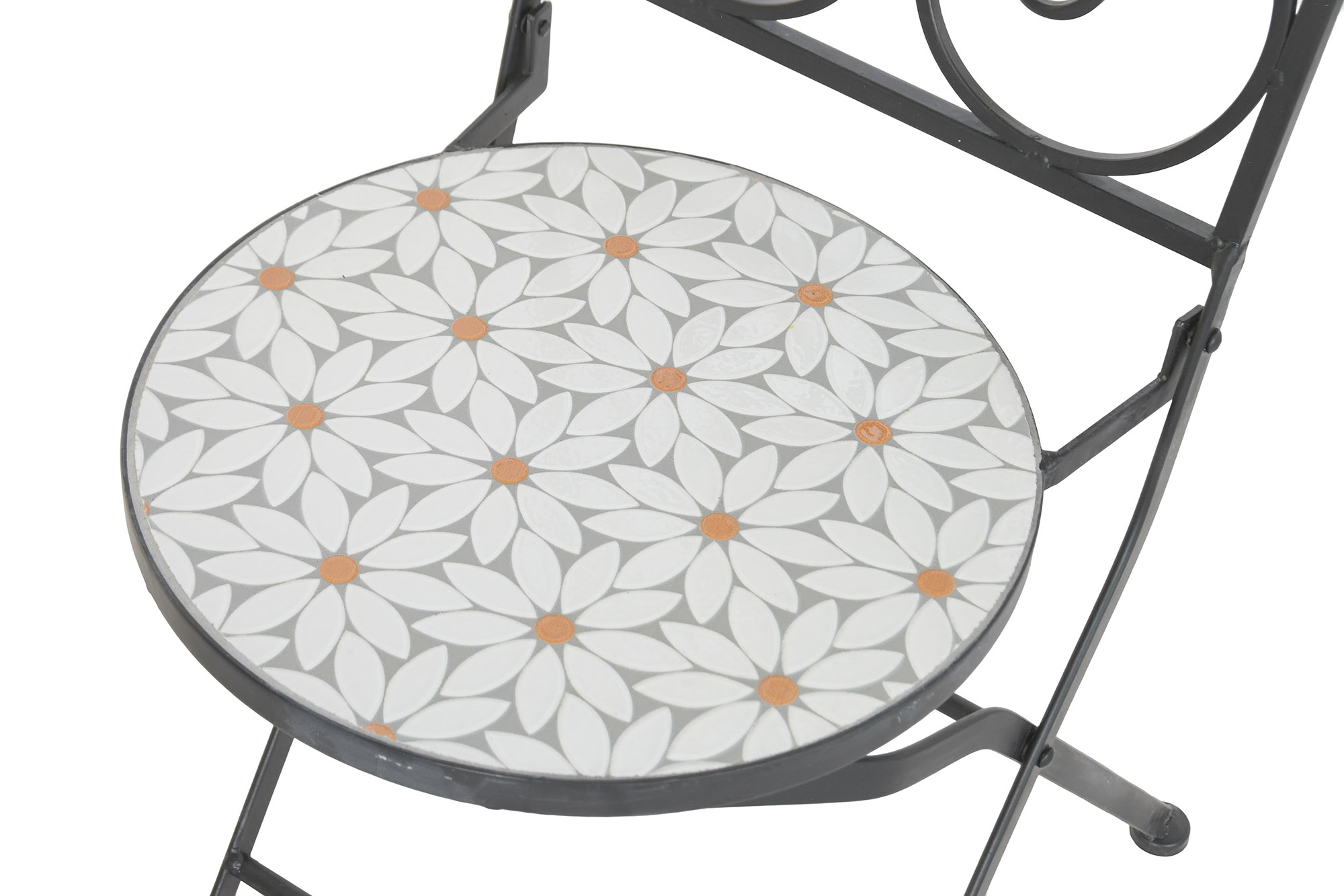 Conjunto de mesa y dos sillas de hierro con acabado en negro, y mosaico de margaritas de azulejos blancos.