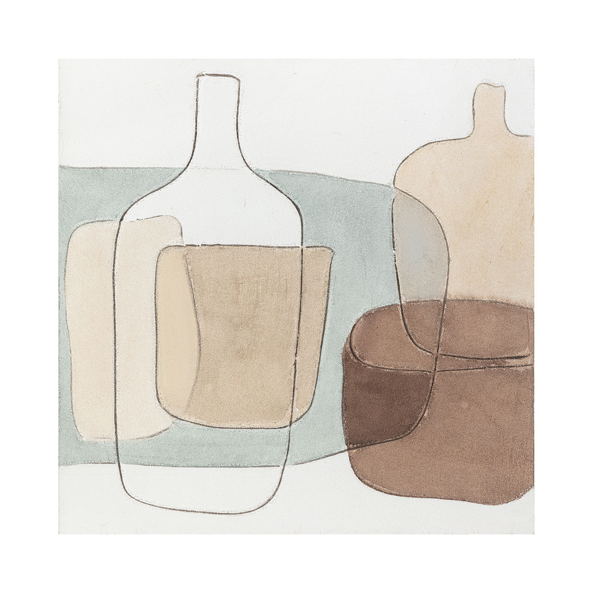 Cuadro pintura abstracta de un bodegón con botellas y recipientes. Colores en blanco azul pastel y tierras.
