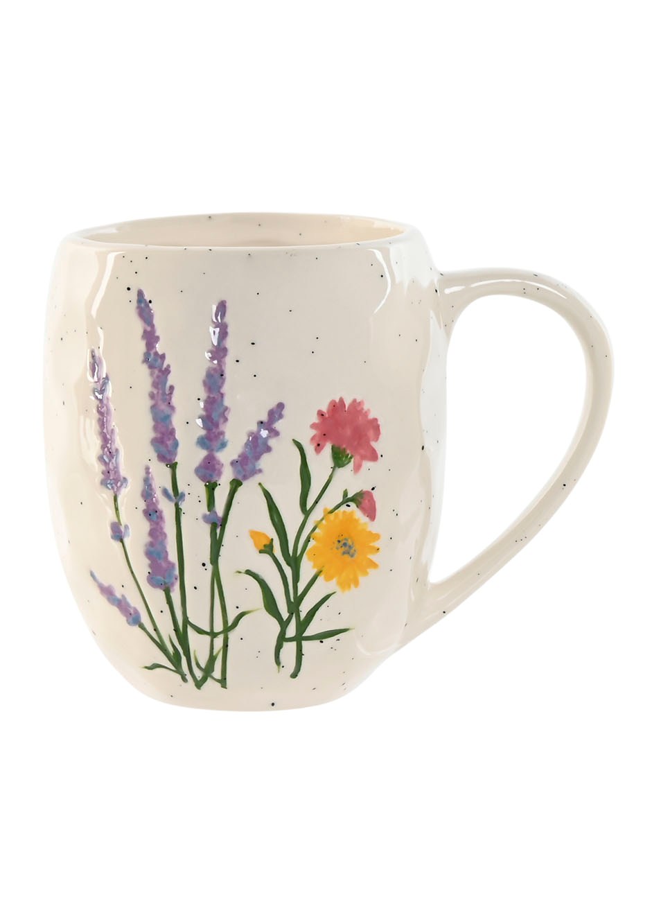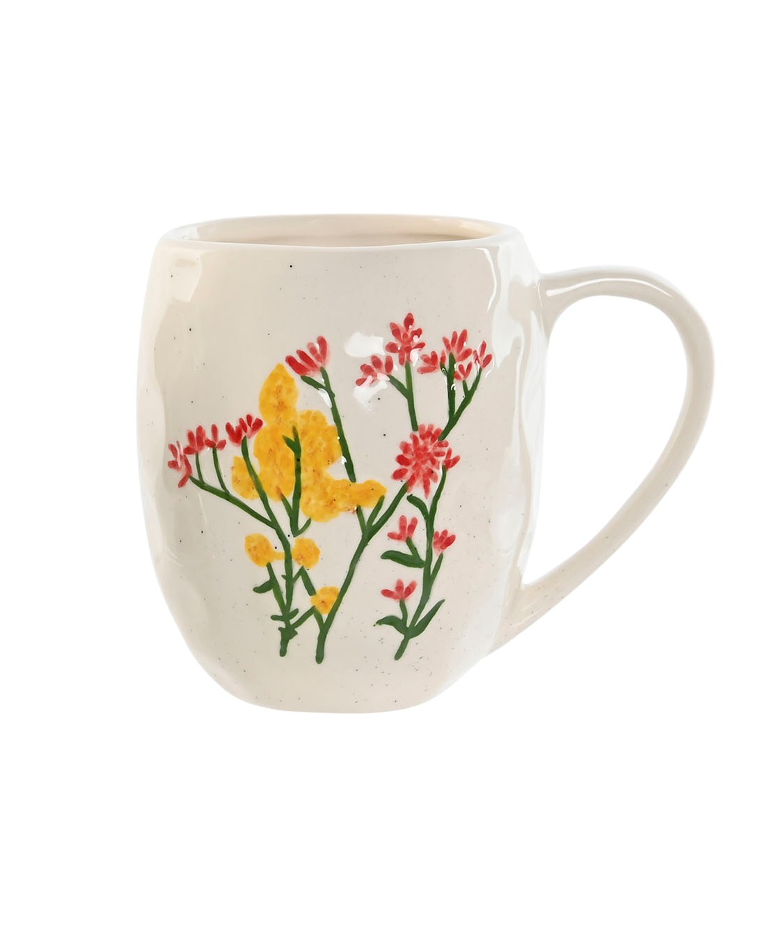 Taza realizada artesanalmente en porcelana blanca con dibujo de flores.